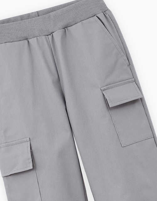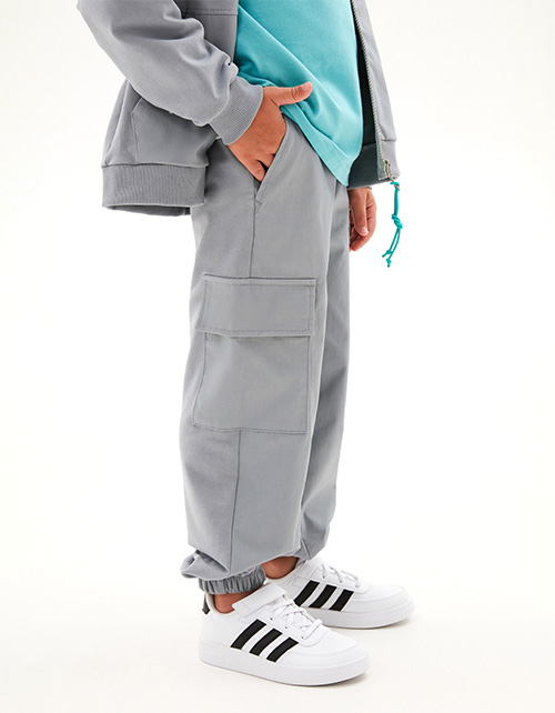 Утилитарные брюки интересного серо-зелёного оттенка для мальчика. Модель прямого силуэта, со средней посадкой. Мягкий эластичный пояс и манжеты. Комбинация материалов: твил и футер. Брюки дополнены карманами-хулиганами и накладным с клапаном.