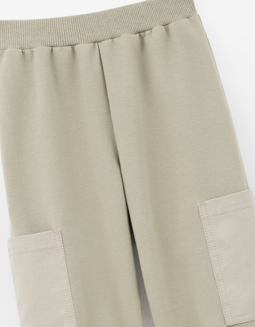 Брюки-карго для мальчика. Прямой объёмный силуэт и средняя посадка обеспечивают комфорт. Пояс и манжеты из эластичной рибаны фиксируют посадку. Накладные карманы подчёркивают утилитарный стиль. Комбинированное изделие из футера с браш?эффектом и твила.
