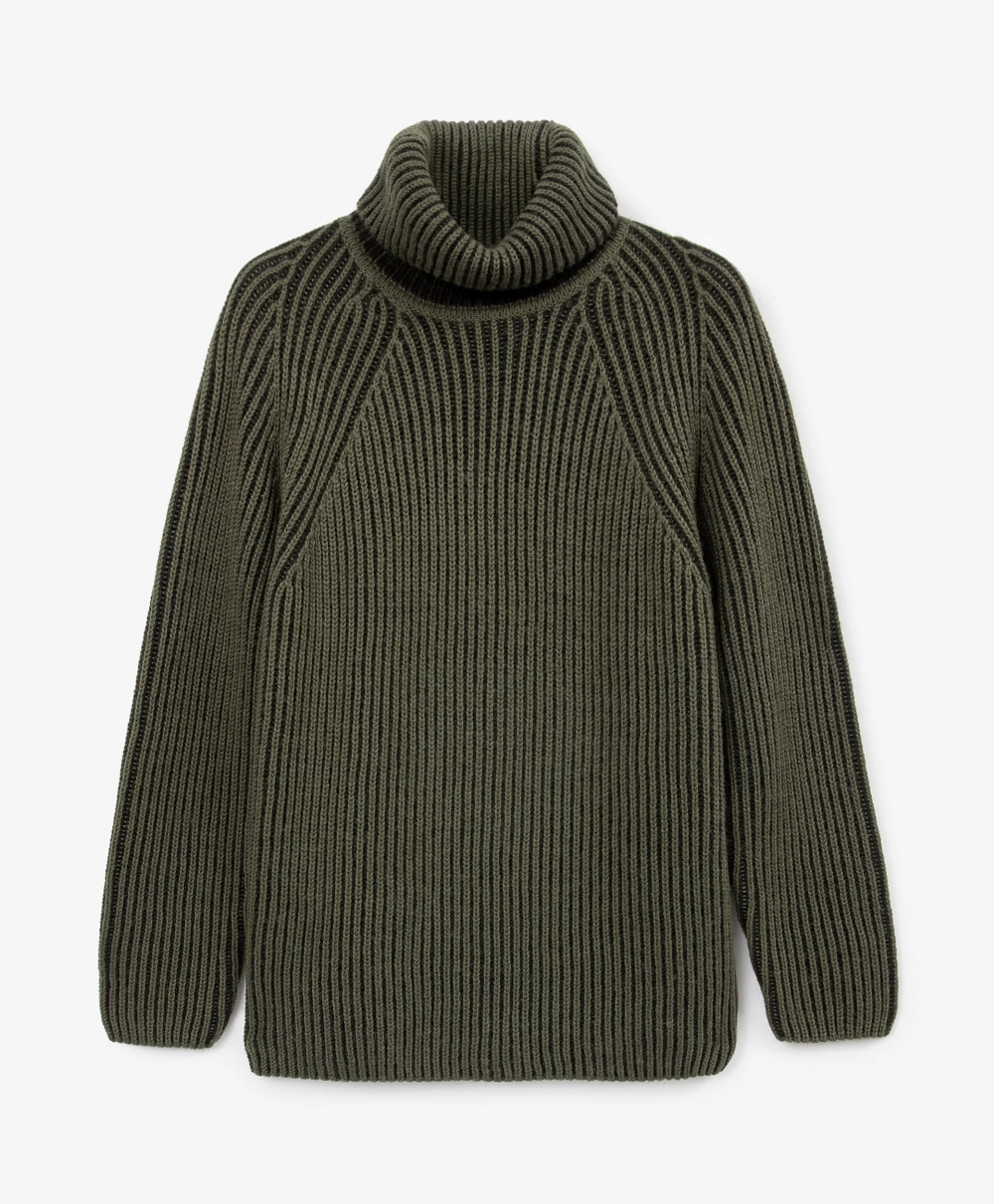 Свободный свитер с высокой горловиной отсылает к энергичным брутальным образам бывалых путешественников, участников экспедиций. Выполненный из мягкой теплой полушерстяной пряжи, свитер с рукавами-реглан хорошо держит форму и очень приятен при тактильном контакте. Особенность модели - рибовое переплетение с контрастной черной изнанкой, формирующей интересную двухцветную структуру изделия. Благодаря ему, свитер выглядит очень фактурно, объемно, создавая красивый визуальный и тактильный контраст с любыми джинсами, брюками из твила, гладкими трикотажными джоггерами.