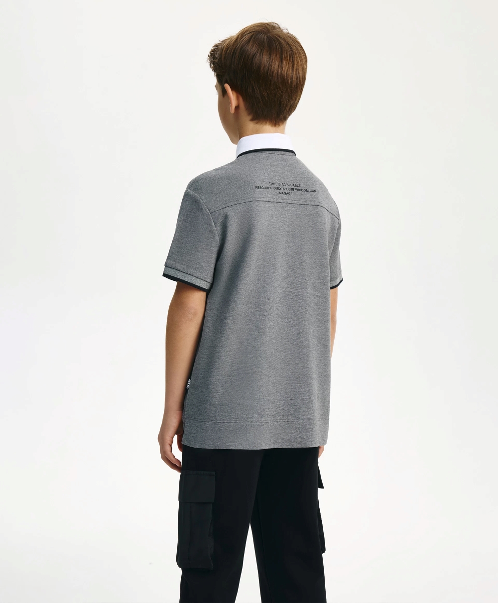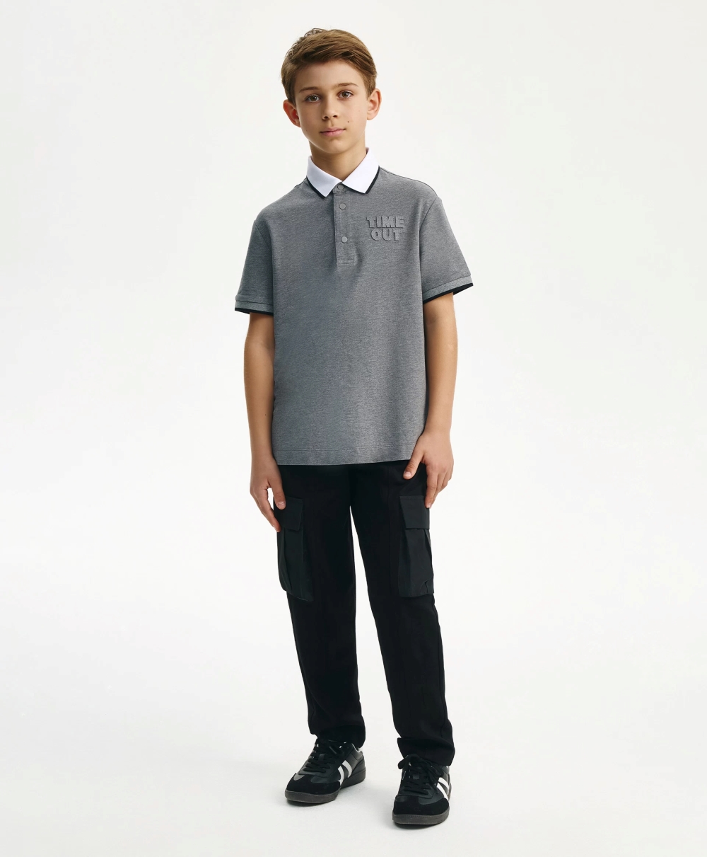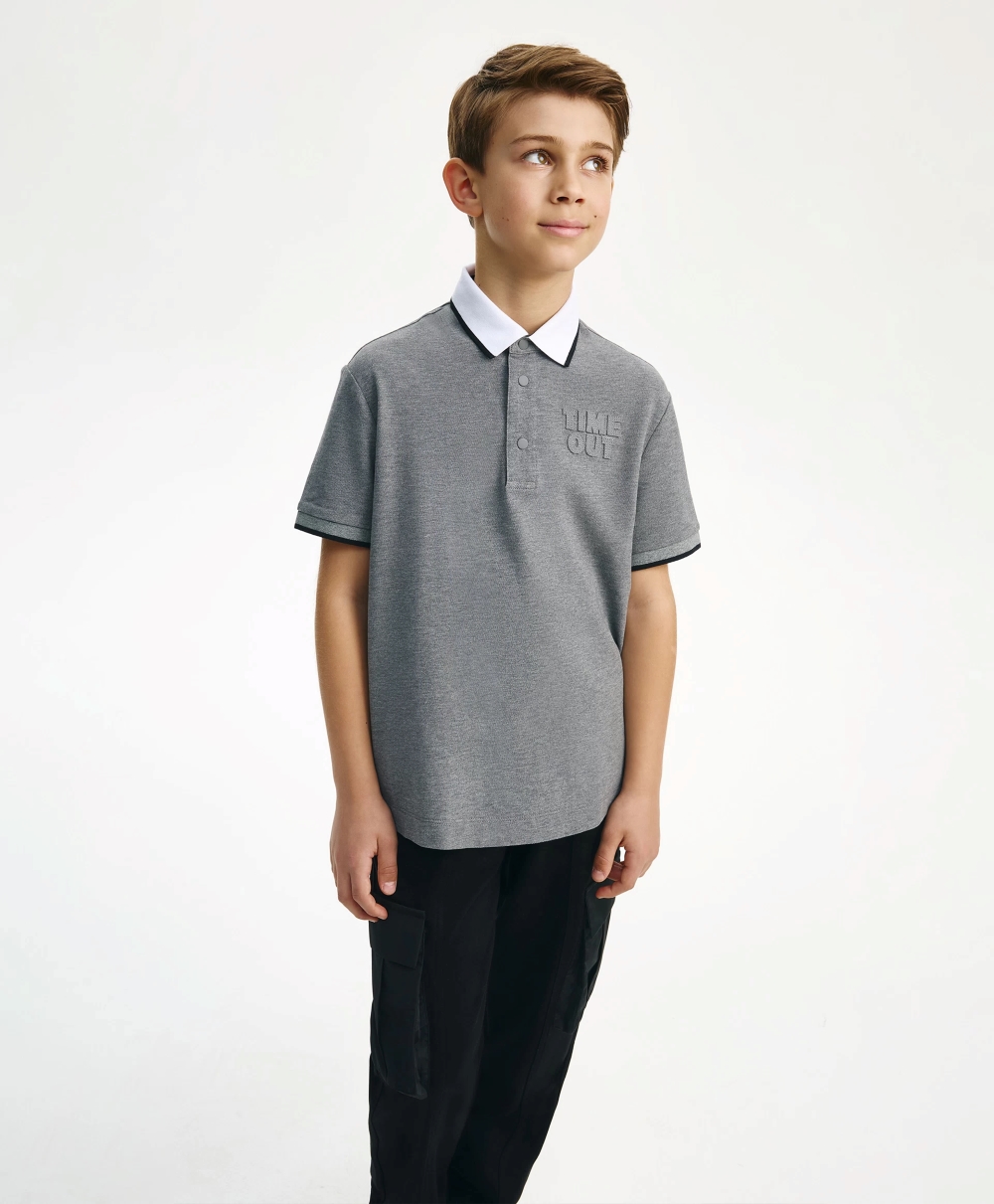 Серое меланжевое поло с коротким рукавом – стильная и комфортная вещь для повседневного гардероба мальчика. Поло с заниженной линией спинки выполнено из хлопкового пике, обладающего приятной текстурой, прекрасными потребительскими характеристиками, превосходным внешним видом. Контрастная полоска на воротнике и манжетах, а также отделочная внутренняя планка придают классической модели остроту и динамику. Застежка на кнопки делает поло удобным в эксплуатации. Небольшие разрезы в боковых швах обеспечивают свободу движений. На передней части изделия расположена фактурная шрифтовая нашивка, на спинке - лаконичный шрифтовой принт. Поло прекрасно сочетается с текстильными и трикотажными брюками, джинсами, создавая стильные школьные образы и не только.
