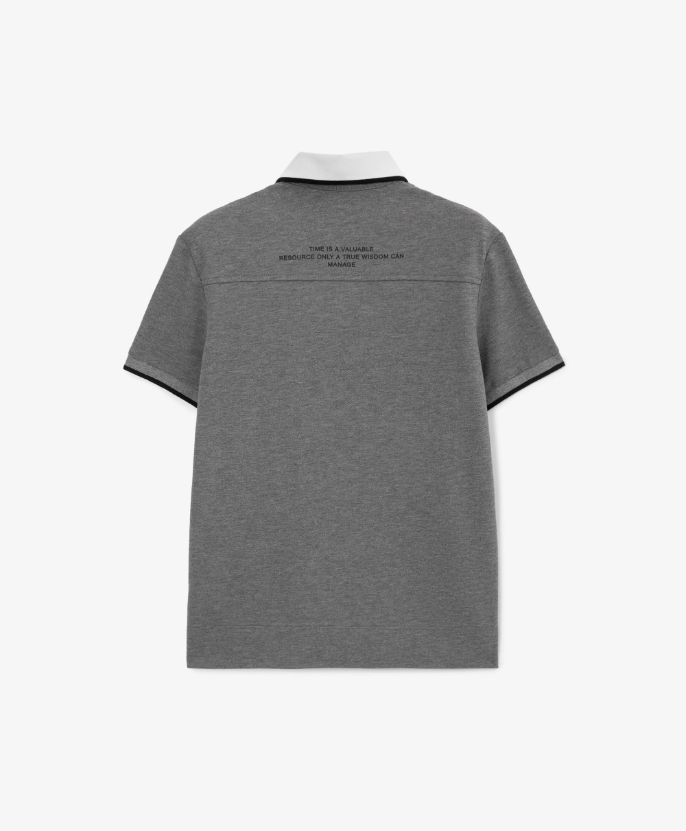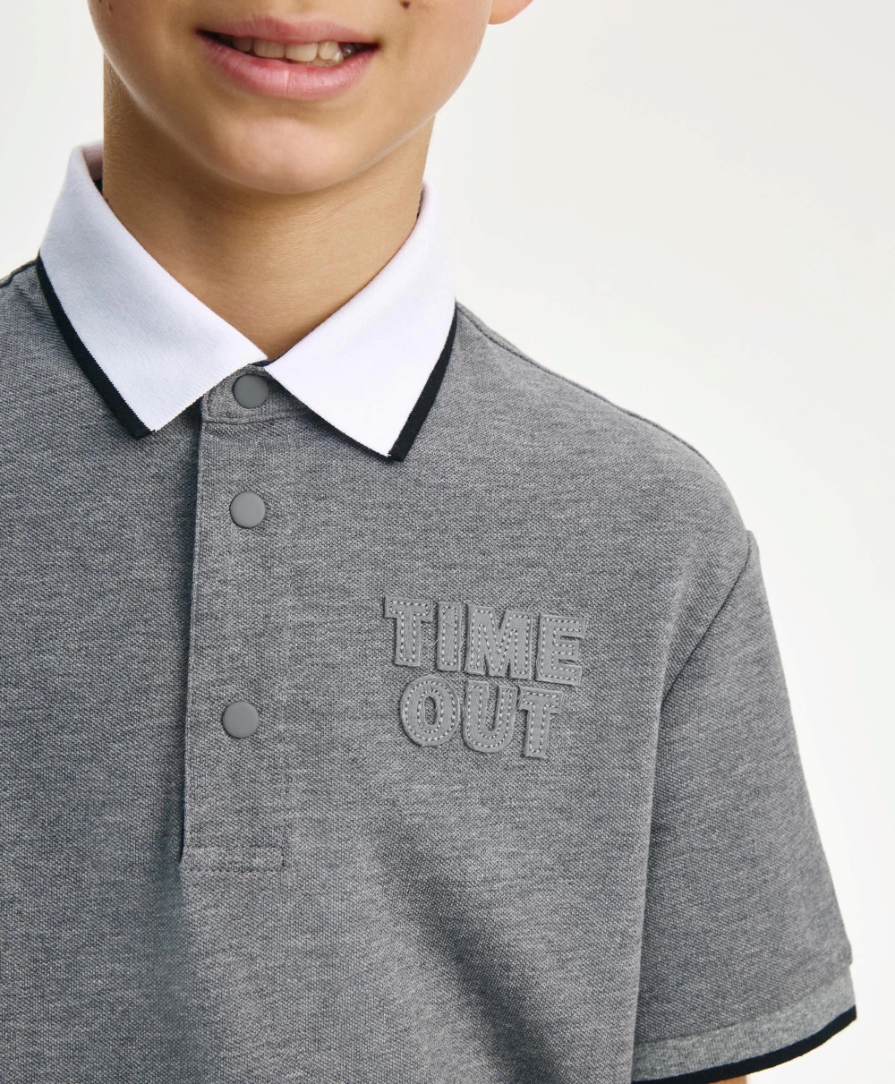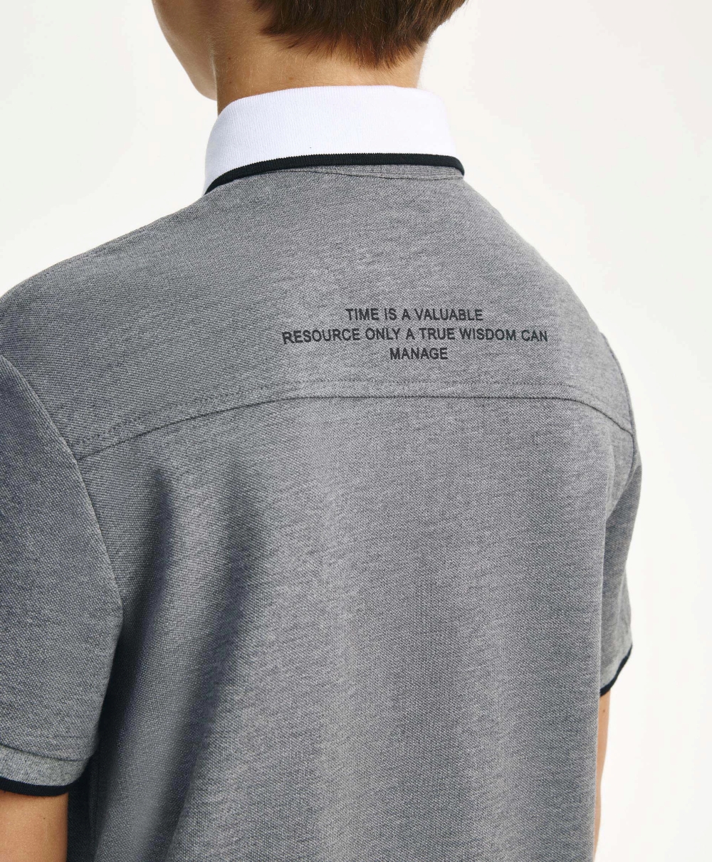 Серое меланжевое поло с коротким рукавом – стильная и комфортная вещь для повседневного гардероба мальчика. Поло с заниженной линией спинки выполнено из хлопкового пике, обладающего приятной текстурой, прекрасными потребительскими характеристиками, превосходным внешним видом. Контрастная полоска на воротнике и манжетах, а также отделочная внутренняя планка придают классической модели остроту и динамику. Застежка на кнопки делает поло удобным в эксплуатации. Небольшие разрезы в боковых швах обеспечивают свободу движений. На передней части изделия расположена фактурная шрифтовая нашивка, на спинке - лаконичный шрифтовой принт. Поло прекрасно сочетается с текстильными и трикотажными брюками, джинсами, создавая стильные школьные образы и не только.