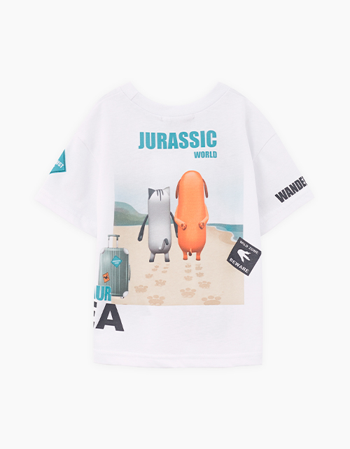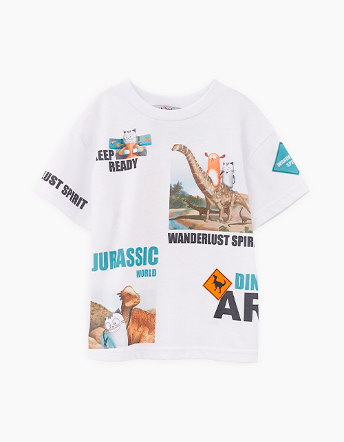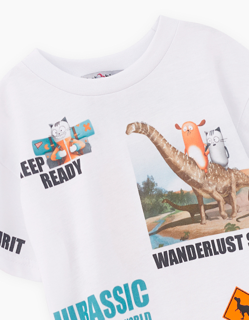 Дизайнерская белая футболка для мальчика. Прямая объёмная модель. Спущенная линия плеча. Эластичная горловина. Футболка с авторскими принтами по всему изделию.