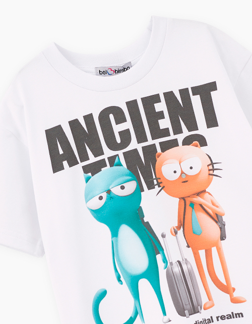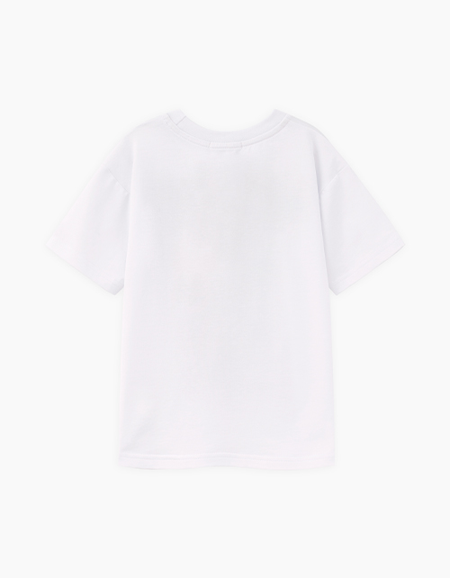 Дизайнерская белая футболка для мальчика. Модель комфортного прямого силуэта. Спущенная линия плеча. Эластичная горловина. Футболка с акцентным авторским принтом.