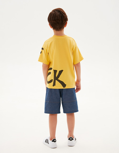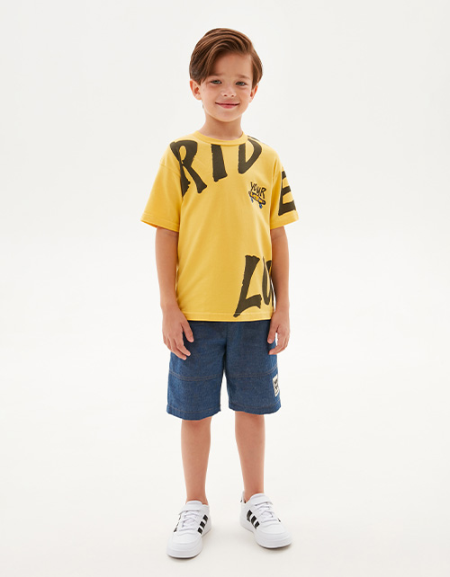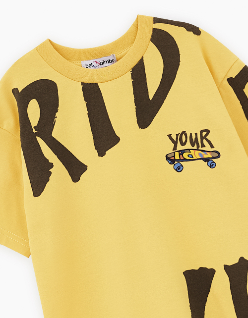 Дизайнерская футболка тёплого медового оттенка для мальчика. Прямая модель. Спущенная линия плеча. Эластичная горловина. Футболка с авторским принтом, безопасная и качественная экосольвентная печать.