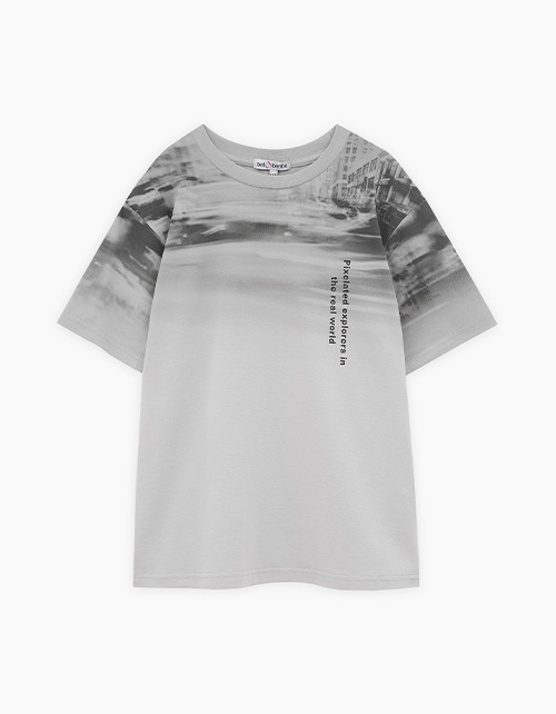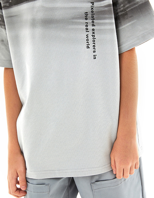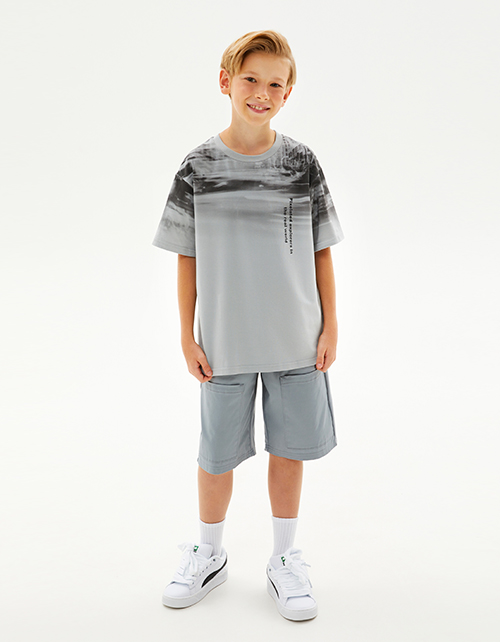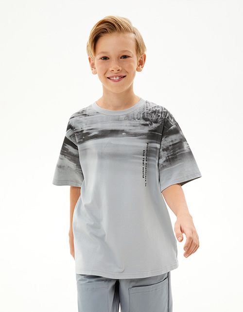 Дизайнерская футболка интересного серо-зелёного оттенка для мальчика. Прямая объёмная модель. Спущенная линия плеча. Эластичная горловина. Футболка с авторским принтом, безопасная и качественная трансферная печать.