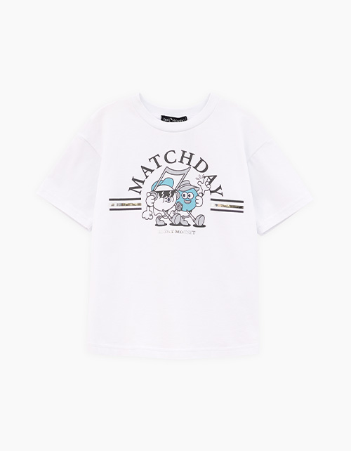 Дизайнерская белая футболка для мальчика. Прямая модель. Спущенная линия плеча. Эластичная горловина. Футболка декорирована авторским принтов с блеском.