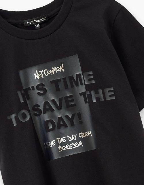 Чёрная футболка для мальчика. Прямая модель с коротким рукавом. Эластичная горловина из рибаны. Декорирована авторской трансферной плёнкой. Выполнена из кулирной глади. Подойдёт для стильных образов с брюками.