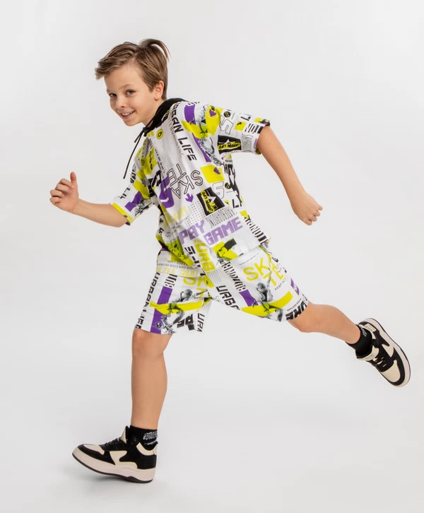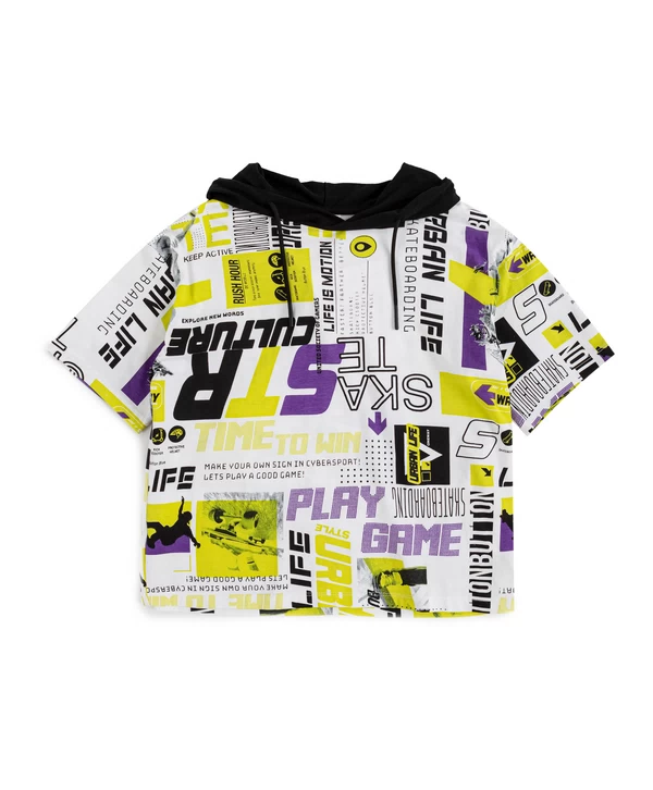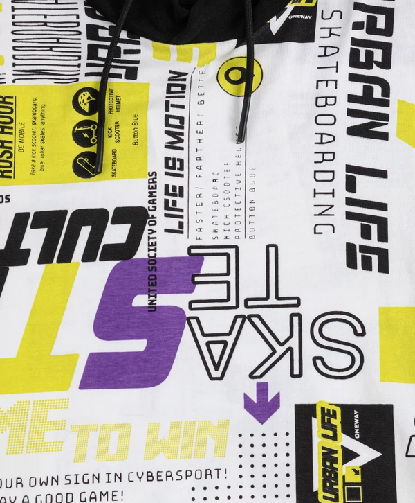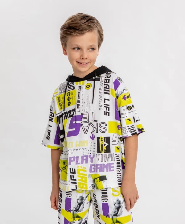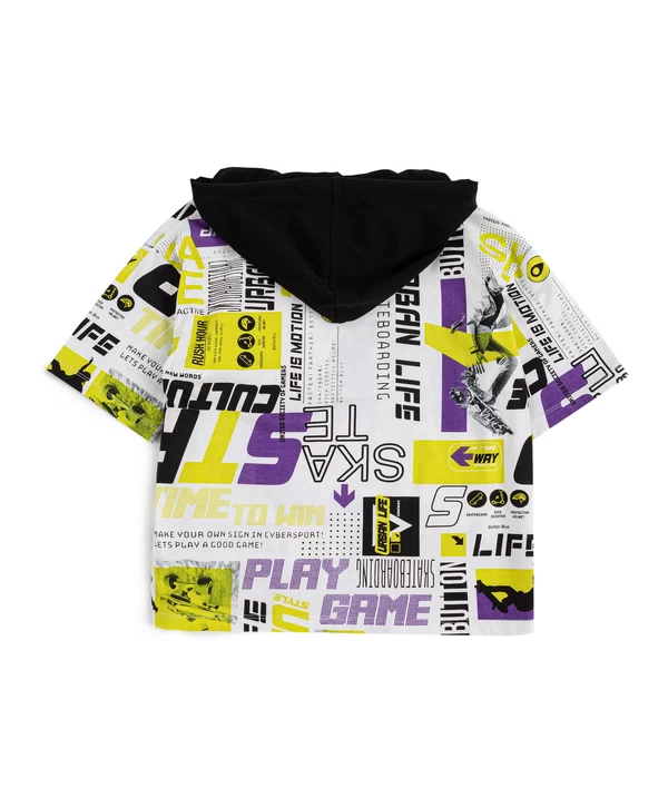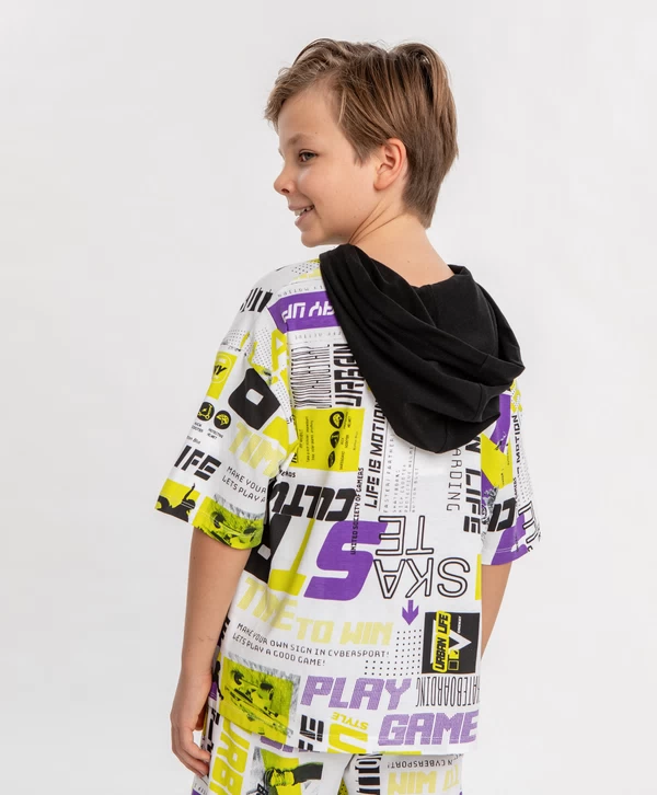 Футболка с капюшоном. Белый цвет и контрастный принт по всей футболке точно привлекут внимание окружающих к образу маленького модника. Футболка сделана из 95% хлопка и 5% эластана. Такой состав и оверсайз силуэт обеспечивают комфорт и свободу движений без прилегания. Капюшон добавляет дополнительный акцент, может защитить от ветра и солнца. Принт в стиле урбан и спорт поможет выделиться среди сверстников. Этот предмет гардероба - олицетворение удобства и стиля.