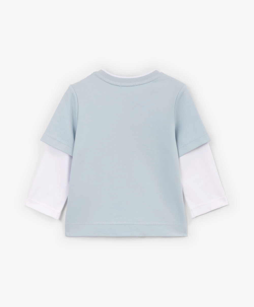 Двухцветный лонгслив с имитацией многослойности, выполненный из мягкого хлопкового интерлока, - прекрасный вариант и для домашнего времяпрепровождения, и для образов на выход. Пластичный дышащий трикотаж обеспечит комфорт и свободу движений. Оригинальный декор с полярным мишкой на передней части понравится юным ценителям стильной интересной графики. Застежка на кнопках в плечевом шве облегчит процесс переодевания, сделав лонгслив самым комфортным атрибутом гардероба маленького стиляги.