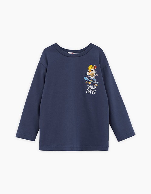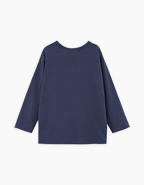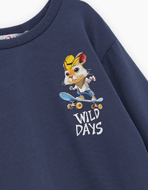 Дизайнерский лонгслив глубокого оттенка деним для мальчика. Модель комфортного прямого силуэта. Приспущенная линия плеча. Эластичная горловина. Лонгслив с авторским принтом.