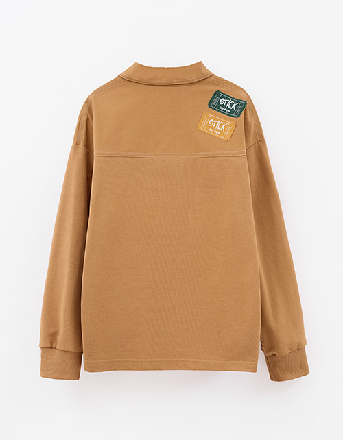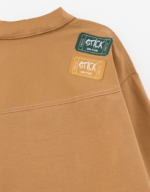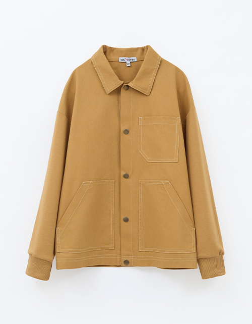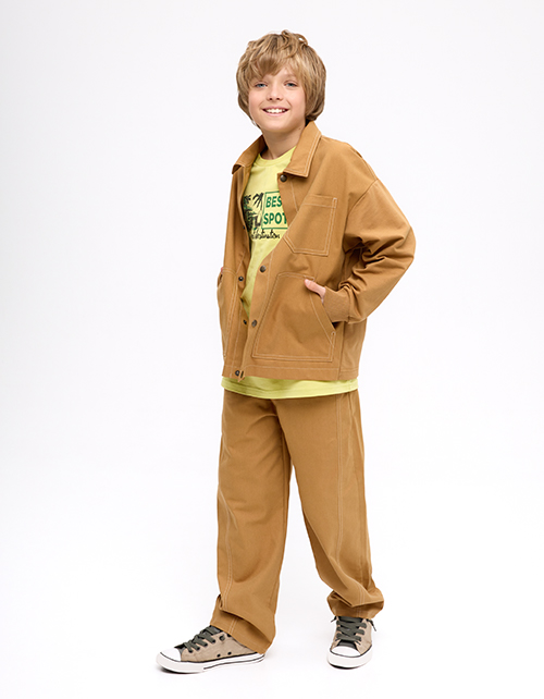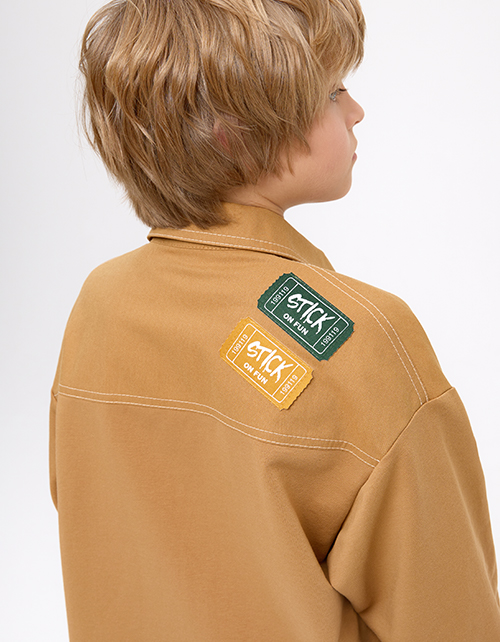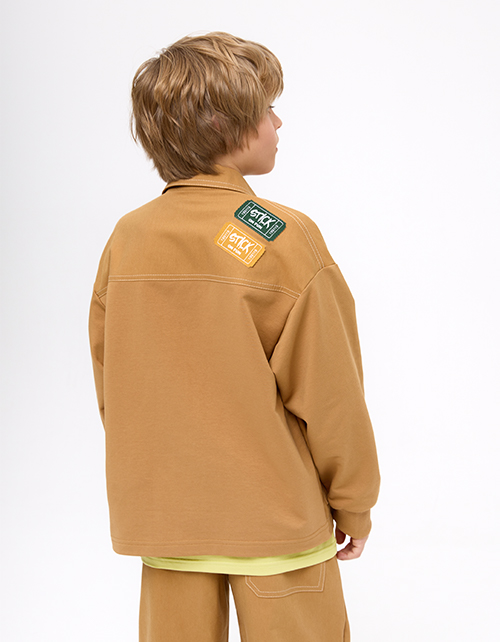 Утилитарный жакет для мальчика. Модель прямого силуэта из твила и мягкого футера - удобная и практичная. Отложной воротник и накладные карманы добавляют функциональности. Крафтовая жаккардовая лейба и латуневые кнопки подчёркивают стильные акценты.