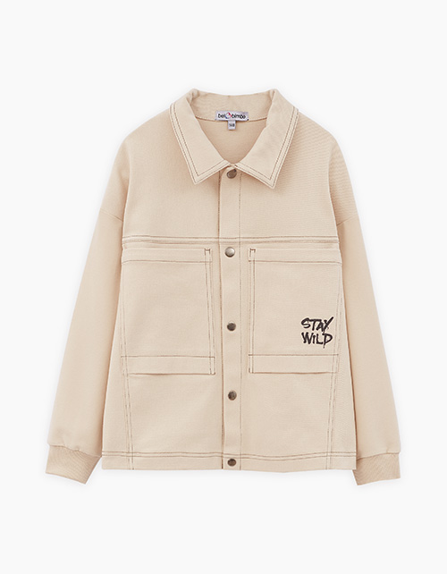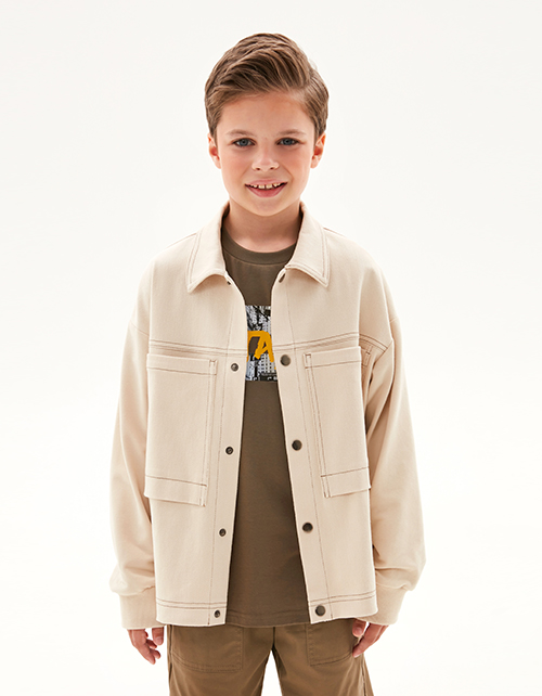 Трендовый жакет-джуда оттенка экрю для мальчика. Прямая объёмная модель. Спущенная линия плеча. Мягкие эластичные манжеты. Низ изделия сзади из рибаны. Накладные карманы. Застёжка на кнопки. Комбинация материалов: твил и тактильно приятный футер.