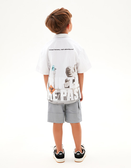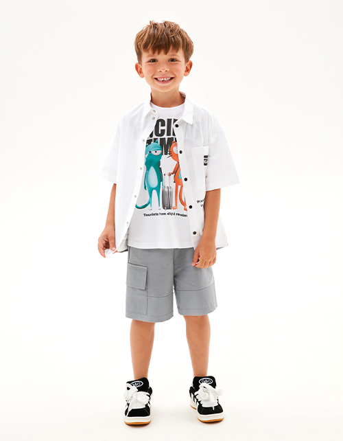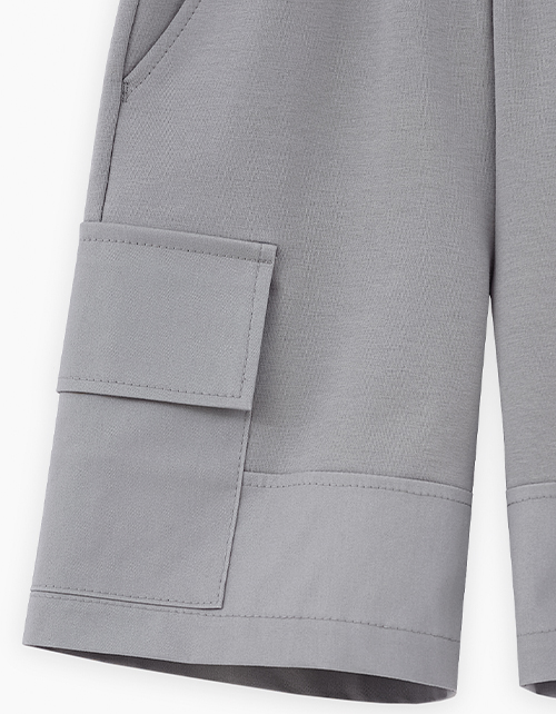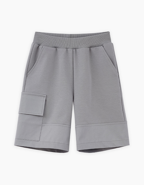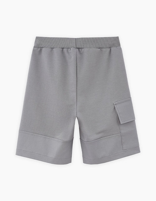 Шорты интересного серо-зелёного оттенка для мальчика. Модель прямого силуэта. Изделие на мягком поясе, со средней посадкой. Изделие дополнено карманами-хулиганами и накладным с клапаном. Комбинация материалов: футер и твил.