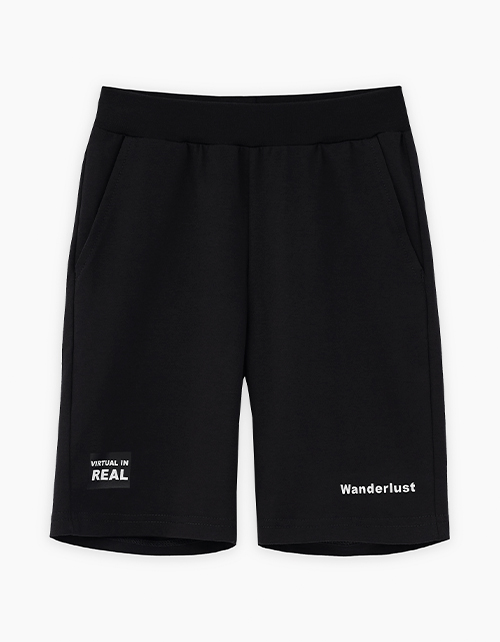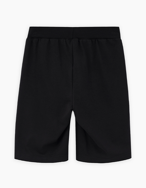 Чёрные шорты для мальчика. Комфортная прямая модель. Изделие на мягком эластичном поясе, со средней посадкой. Шорты дополнены карманами-хулиганами. Модель декорирована авторским шрифтовым принтом.