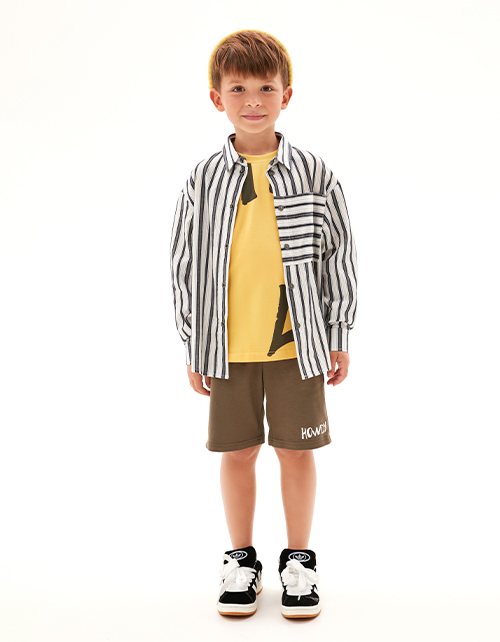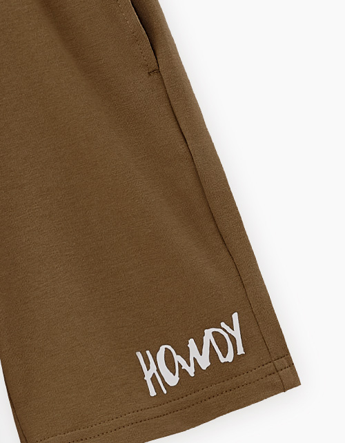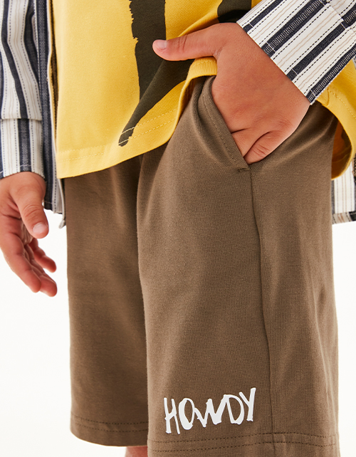 Шорты интересного оттенка тосканской оливы для мальчика. Комфортная прямая модель. Изделие на мягком эластичном поясе, со средней посадкой. Шорты дополнены карманами в шве. Модель декорирована авторским шрифтовым принтом.