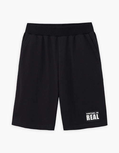 Чёрные шорты для мальчика. Базовая модель прямого силуэта со средней посадкой. Комфортное изделие на мягком эластичном поясе. Карманы-хулиганы. Деликатный шрифтовой принт. Идеально впишутся в любой гардероб ребёнка.