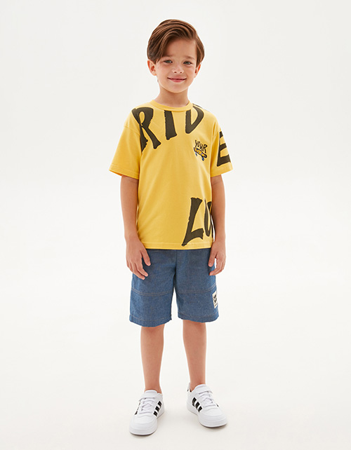 Шорты из облегчённого джинса для мальчика. Модель прямого силуэта. Изделие на мягком поясе, со средней посадкой. Шорты дополнены карманами-хулиганами. Декорированы контрастными отстрочками и нашивкой.