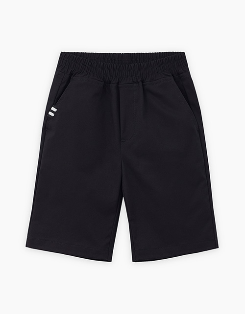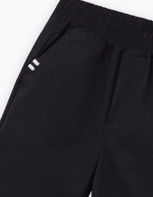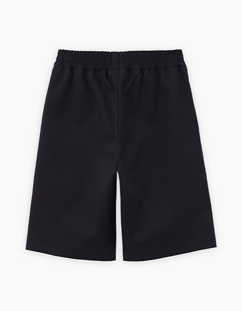 Чёрные шорты из твила для мальчика. Модель прямого силуэта, умеренно удлинённая. Средняя посадка, мягкий эластичный пояс. Дополнены карманами-хулиганами. Лаконичный декор репсовой тесьмой.
