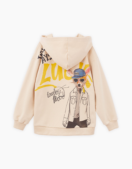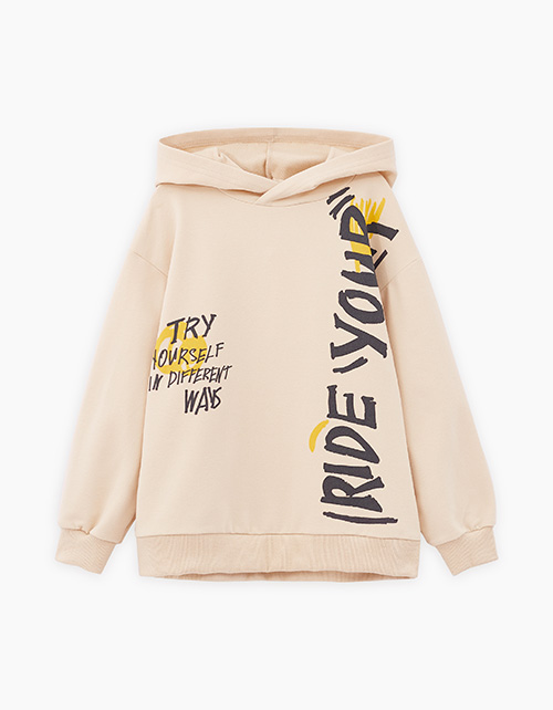 Худи светло-бежевого оттенка для мальчика. Прямая объёмная модель. Глубокий капюшон. Спущенная линия плеча. Эластичные манжеты и низ изделия из рибаны. Худи из тактильно приятного материала. Акцентный герой и шрифтовые принты в стиле граффити.