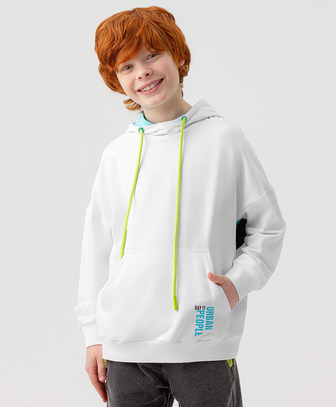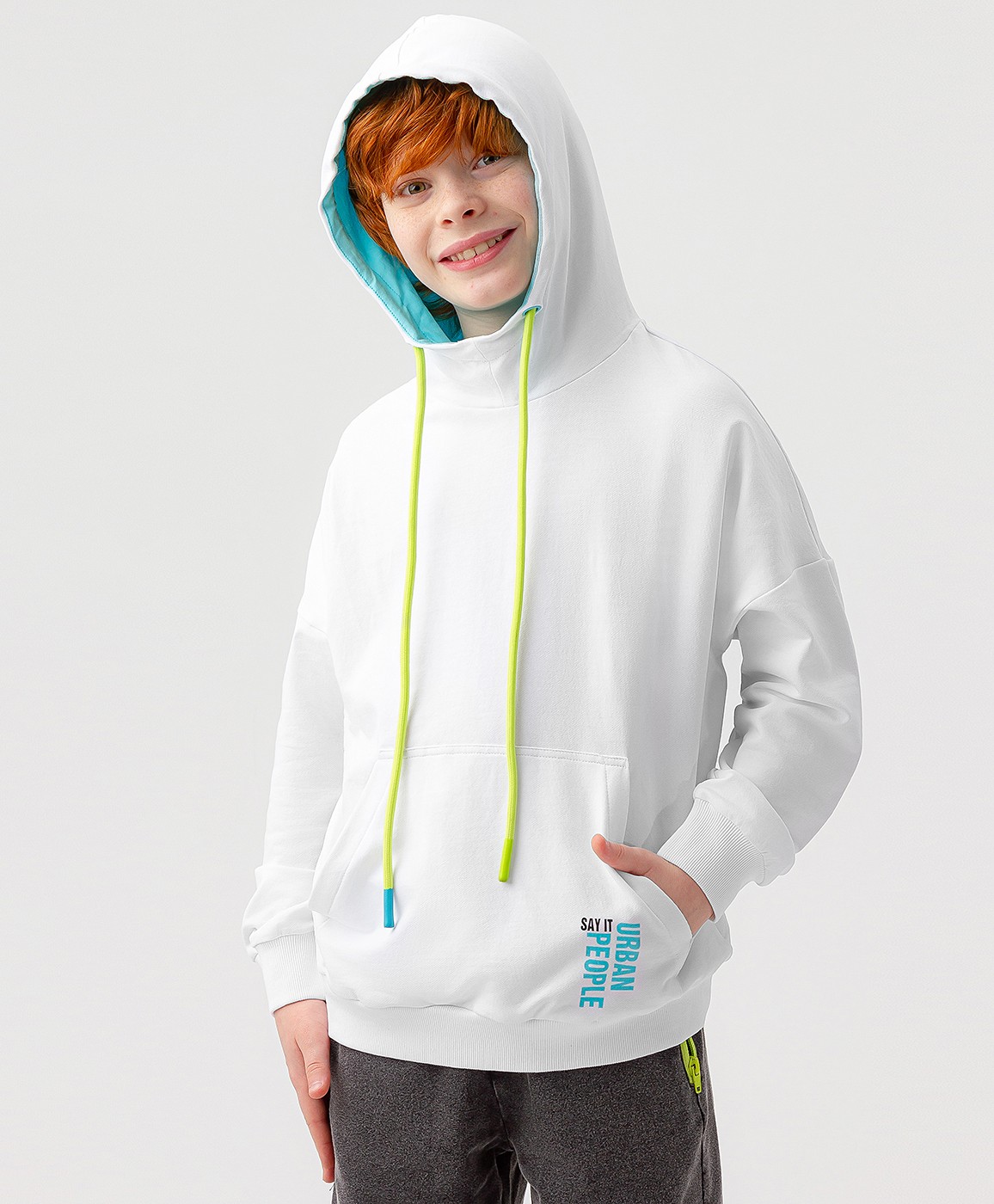 Белое оверсайз худи для мальчика подростка - это захватывающе стильное сочетание минимализма и яркости. Натуральная хлопковая ткань с небольшим добавлением эластана подарит приятные ощущения при соприкосновении с кожей, обеспечивая оптимальный воздухообмен. Прямой крой толстовки из футера в сочетании со спущенной линией плеча способствует свободной посадке для легкости в движениях. Удобный капюшон с высоким воротом можно затянуть при помощи функциональных и ярких завязок. Низ кофты и манжеты на рукавах выполнены из эластичной рибовой ткани, поэтому будут мягко прилегать к телу. Объемный карман-кенгуру позволит носить в нем небольшие вещи или прятать руки. Весь дизайн кофты состоит из деталей, которые определенно порадуют подростка - крупный и яркий текстовый принт на спинке, голубой подклад у капюшона и небольшая текстовая надпись на полочке снизу. Белая кофта с капюшоном оптимально сочетается с джоггерами, шортами и джинсами из коллекций Button Blue.