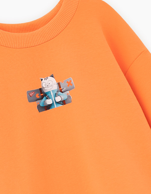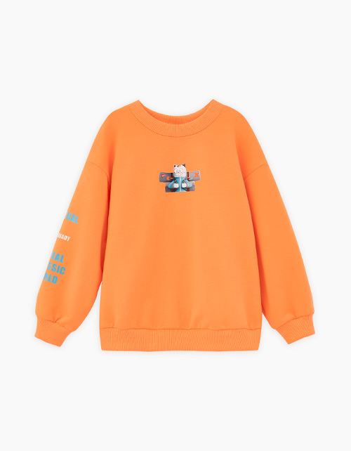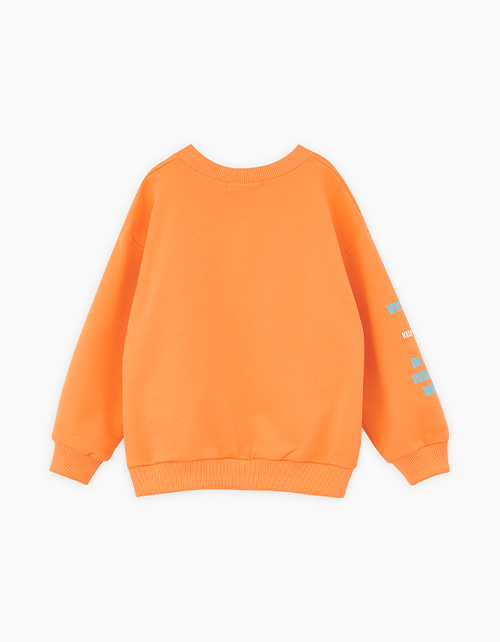 Дизайнерский свитшот сочного оттенка абрикос для мальчика. Комфортная прямая объёмная модель. Спущенная линия плеча. Горловина, манжеты и низ изделия из эластичной рибаны. Свитшот из тактильно приятного материала с бархатистым эффектом. Авторские принты.