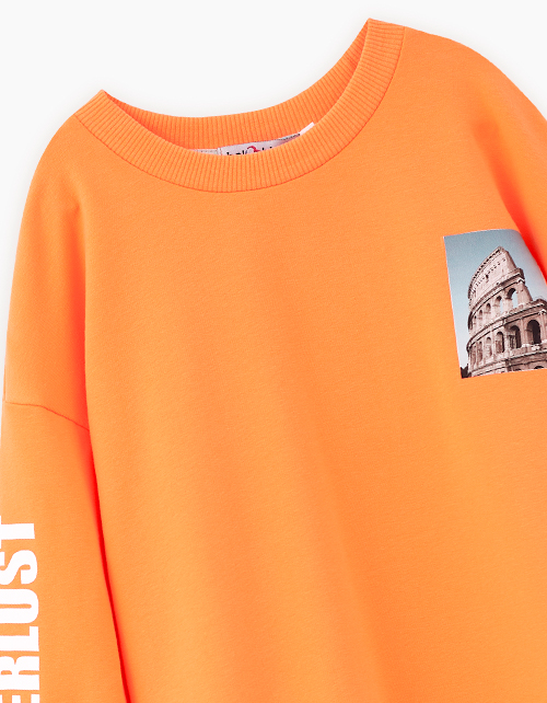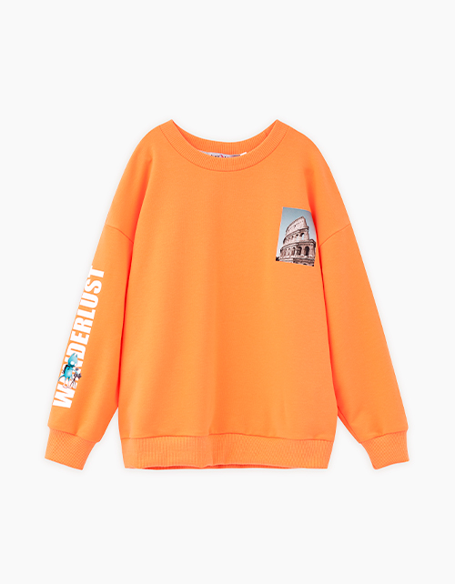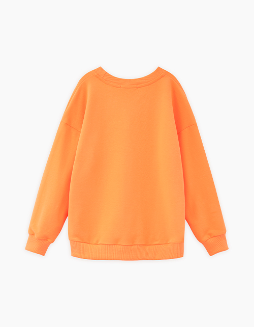 Дизайнерский свитшот сочного оттенка абрикос для мальчика. Комфортная прямая объёмная модель. Спущенная линия плеча. Горловина, манжеты и низ изделия из эластичной рибаны. Свитшот из тактильно приятного материала с бархатистым эффектом. Авторские принты.