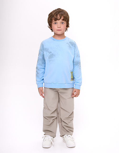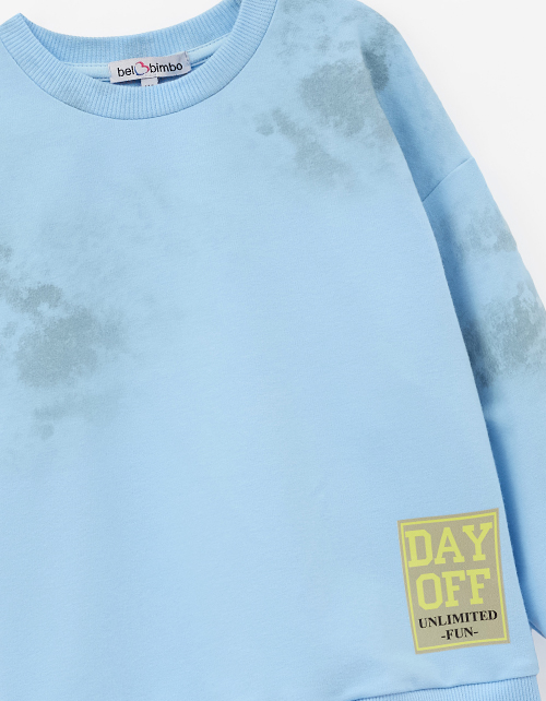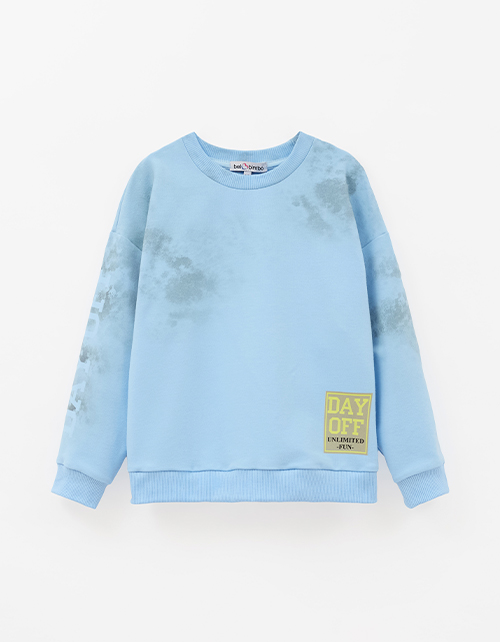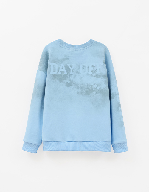 Светло-голубой свитшот из футера с браш-эффектом - мягкий, тёплый и комфортный. Прямой силуэт с низом на рибане обеспечивает аккуратную посадку. Цифровой принт с переходом на горловину создаёт цельный выразительный дизайн, детали усилены DTF?плёнкой.