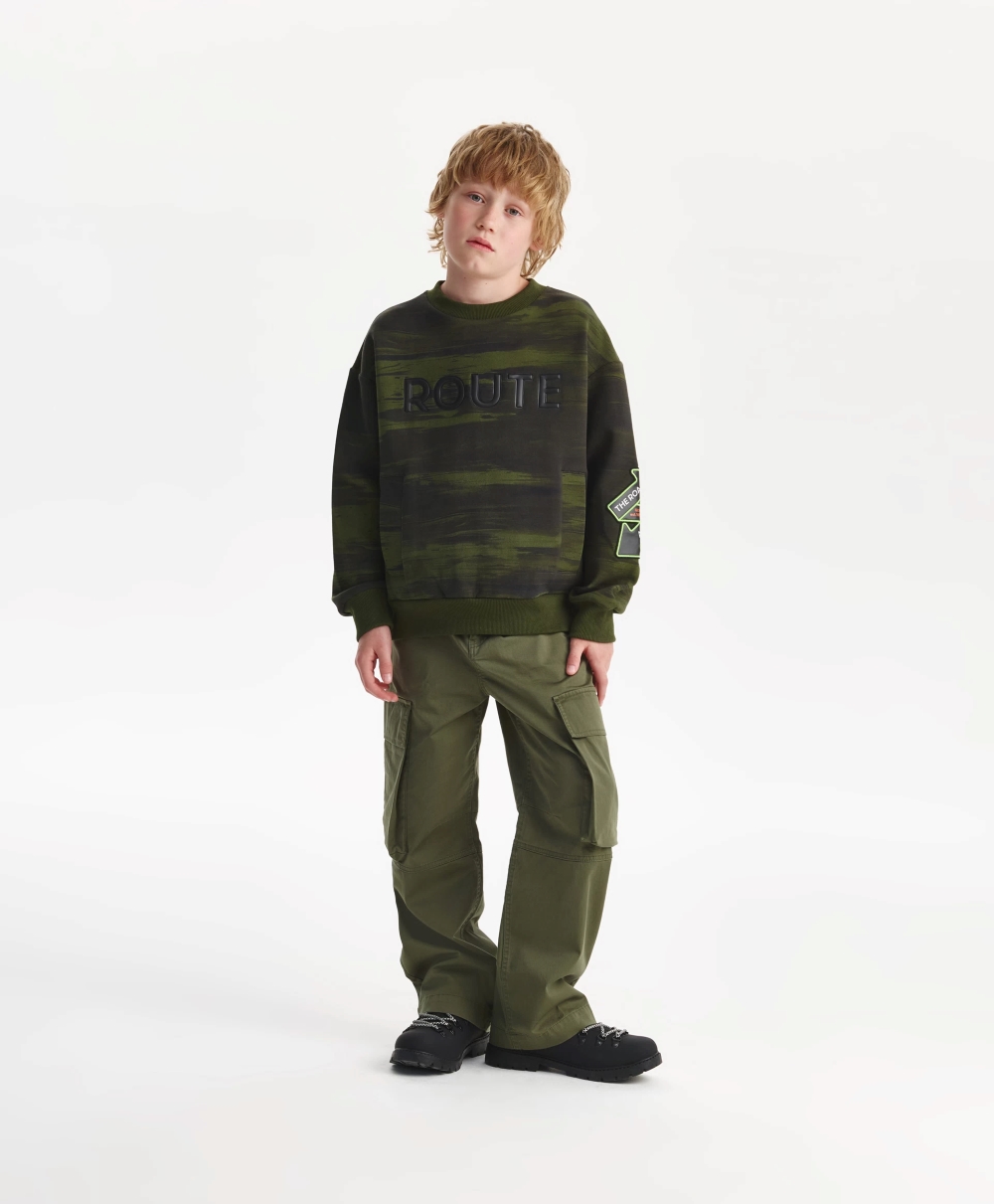 Свитшот силуэта умеренный оверсайз – прекрасный вариант для свободного времени. Он выполнен из мягкого, пластичного и приятного тактильно хлопкового интерлока с оригинальным рисунком, придающим ему брутальность, динамику, остроту. Фишки модели, создающие интересные акценты, - внутренний карман-кенгуру, визуализированный двумя вертикальными листочками, акцентная нашивка на рукаве, шрифтовой декор из экокожи на передней части.
