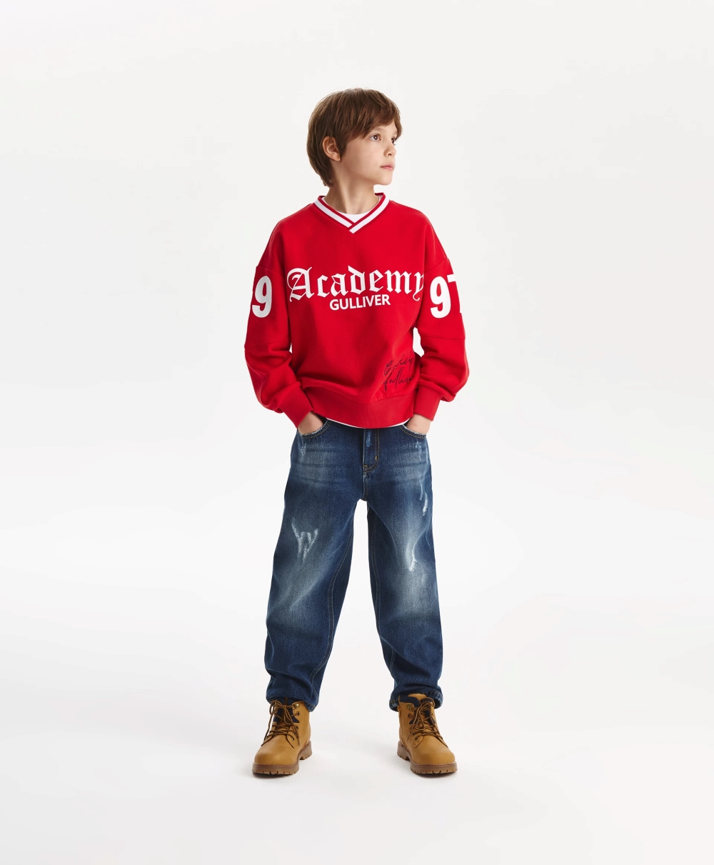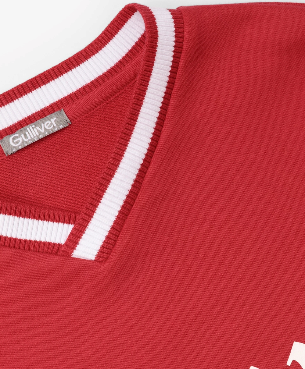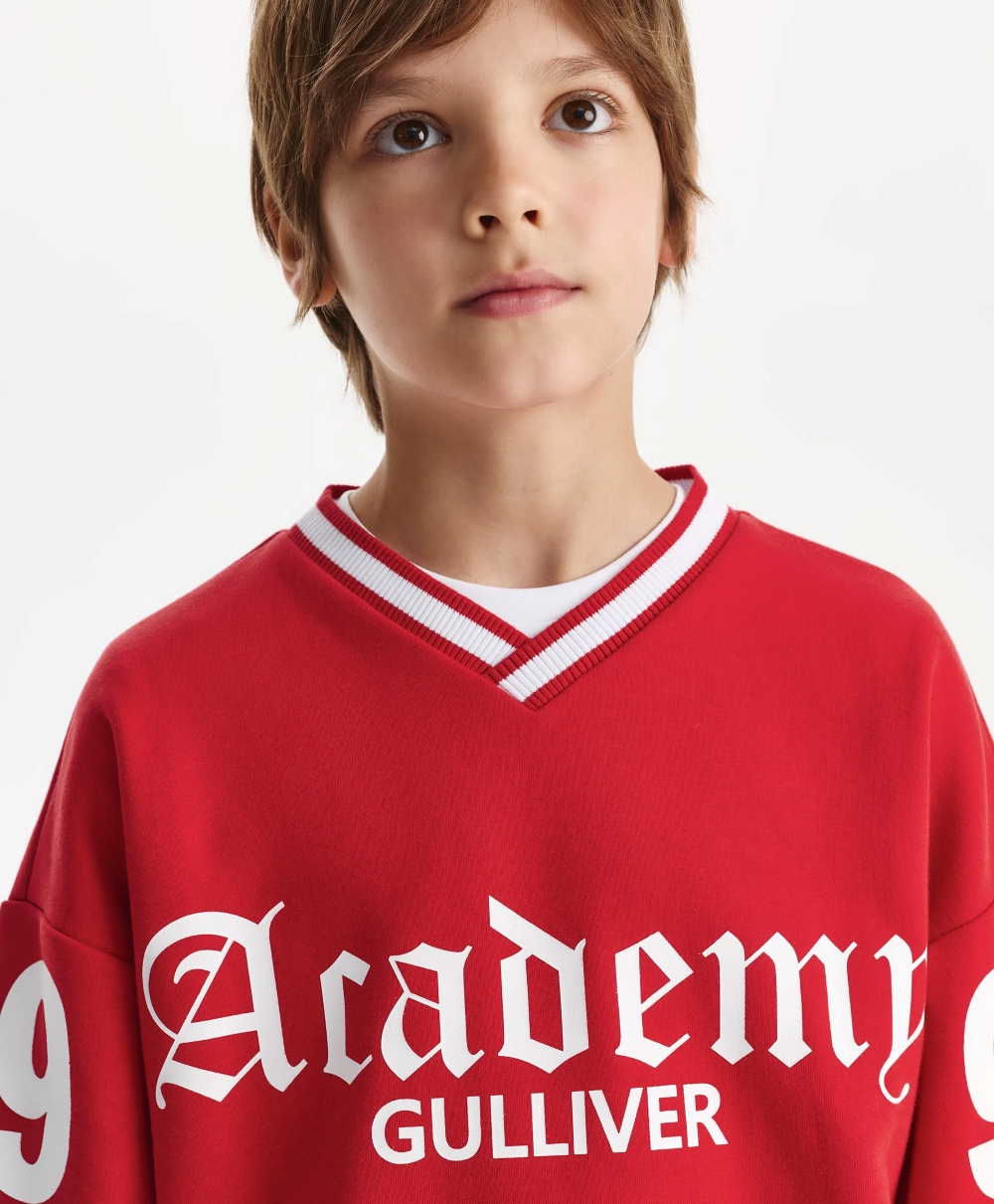 Яркий, динамичный, драйвовый красный свитшот из футера с мягкой петельчатой изнанкой привнесет в образ мальчика динамику и остроту спортивного стиля. В оформлении свитшота использованы крупные шрифтовые принты, контрастная окантовка по V-образной горловине, отражающих драйвовый вайб коллекции Gulliver "Колледж", вдохновленной атмосферой частных школ, спортивных команд, объединенных яркими визуальными символическими атрибутами.