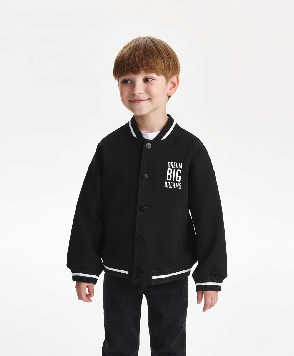 Черная распашная толстовка-бомбер прекрасно впишется в повседневный гардероб мальчика. И как верхний слой ранней осенью, и под куртку или пальто - зимой, бомбер оправдает ожидания от стильной, комфортной, практичной вещи. Выполненный из мягкого и приятного на ощупь интерлока с доминирующим содержанием хлопка, он отлично держит форму, приятен тактильно, прост в эксплуатации и уходе. Благодаря контрастным цветовым сочетаниям в отделке: полосатому рибу на воротнике-полустойке и манжетам, толстовка-бомбер выглядит нарядно. Она красиво завершит комплекты с джинсами, классическими брюками, брюками-карго, создав гармоничные и привлекательные образы мальчика. Бомбер имеет удобные карманы-листочки, застегивается на кнопки. В оформлении модели использованы фактурный шрифтовой принт на передней части и небольшая нашивка на спинке.