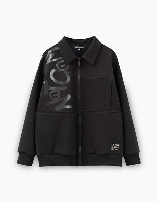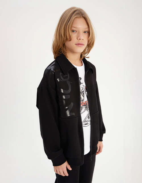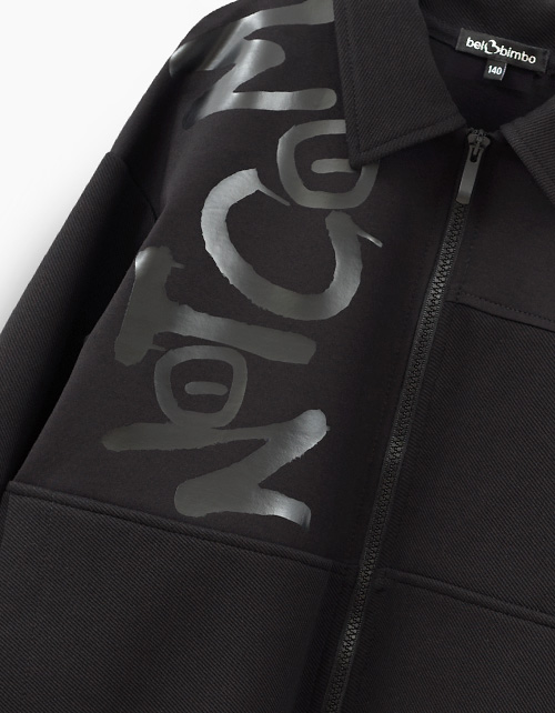 Стильная чёрная толстовка для мальчика. Прямая объёмная модель с приспущенной линией плеча. Низ и манжеты из эластичной рибаны. Застёжка на молнию. Карманы в шве. Декор трансферной плёнкой.