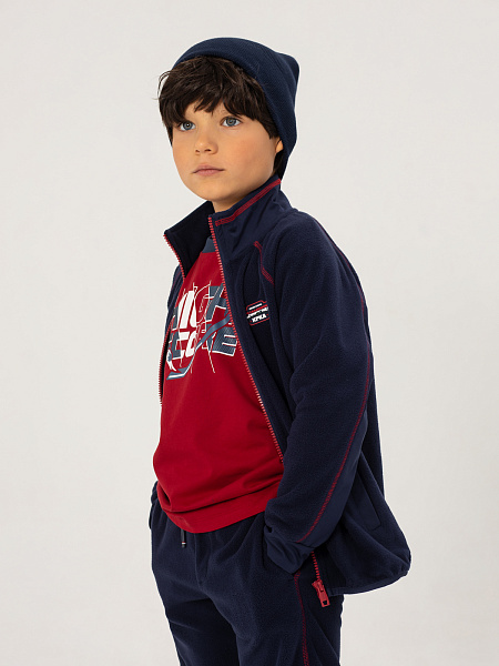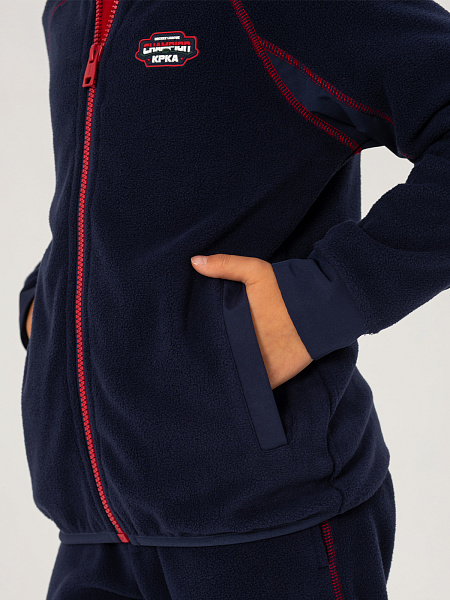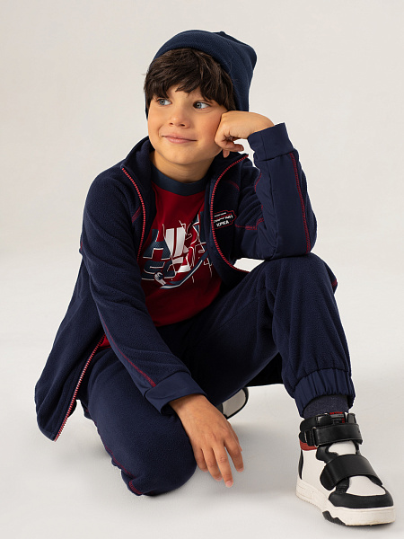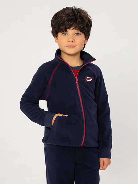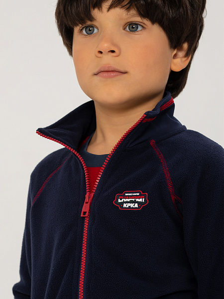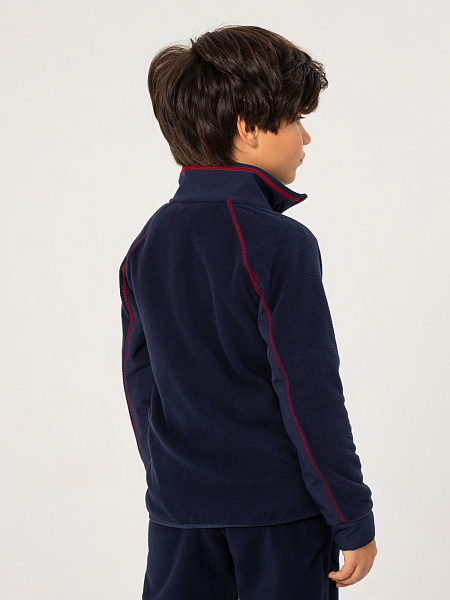 Тёмно-синий флисовый джемпер для мальчиков — идеальное сочетание комфорта и современного дизайна. Модель выделяется контрастной красной молнией и отстрочками, которые придают яркий акцент классическому цвету. Прочный резиновый патч добавляет уникальности. Особенность кроя — удобный рукав реглан, обеспечивающий свободу движений и современный силуэт. Мягкий флис согревает в прохладную погоду и отлично дышит. Джемпер гармонично сочетается с флисовыми брюками из комплекта, создавая практичный зимний образ. Продуманный дизайн и качественные материалы обеспечивают комфорт как при активных играх, так и во время спокойных прогулок в холодное время года.