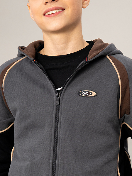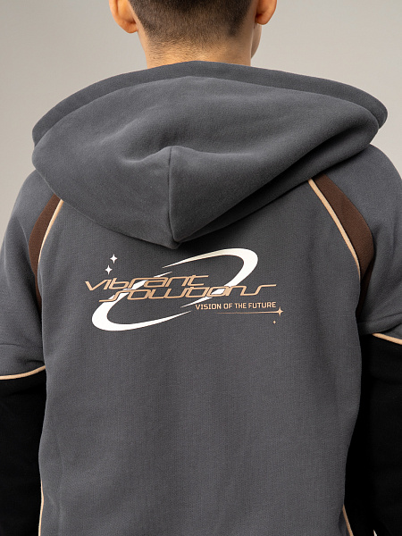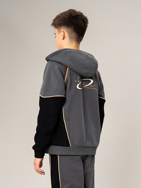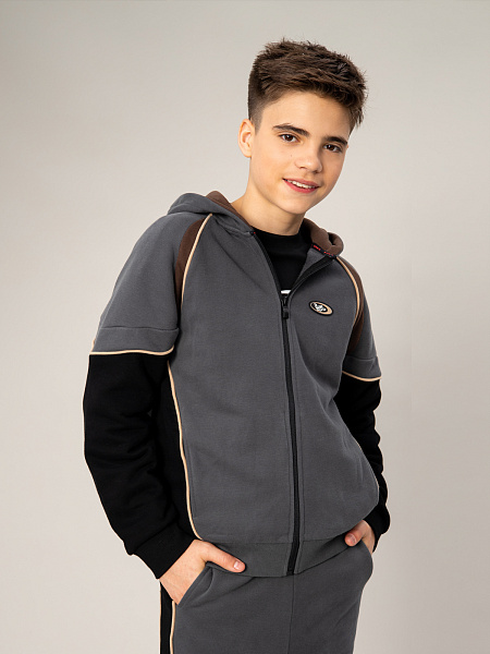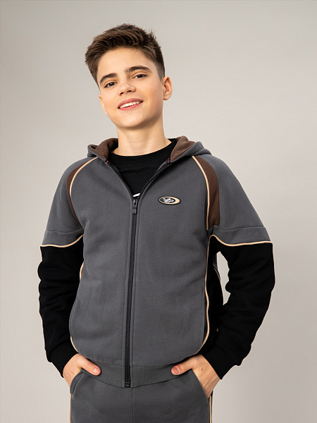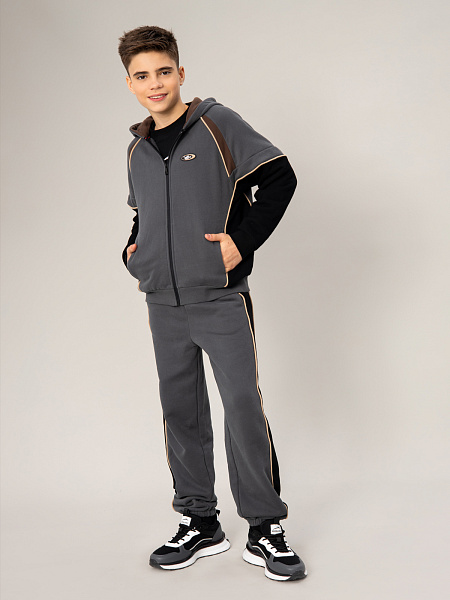 Стильное худи для мальчика в дизайнерском сочетании серого, чёрного и коричневого цветов привлекает внимание оригинальным цветовым решением. Модель выполнена из мягкой плотной ткани, состоящей из хлопка с добавлением полиэстера, что обеспечивает её износостойкость и комфорт при носке. Дизайн дополняют контрастные канты и практичный капюшон. Удобная застёжка-молния делает использование худи максимально комфортным. На спине расположен выразительный принт, который придаёт изделию индивидуальность. Свободный силуэт создаёт современный образ, актуальный для молодёжи. Эластичные манжеты по низу и рукавам обеспечивают плотное прилегание и сохраняют форму изделия. Худи идеально подходит как для повседневной носки, так и для активного отдыха. В комплекте идут брюки аналогичного дизайна, что позволяет создать гармоничный образ.