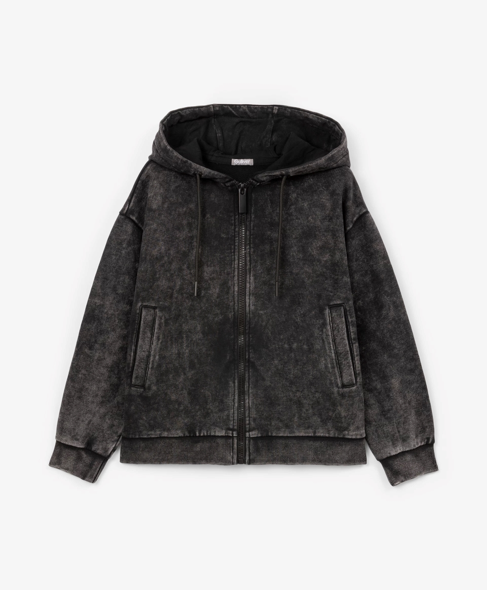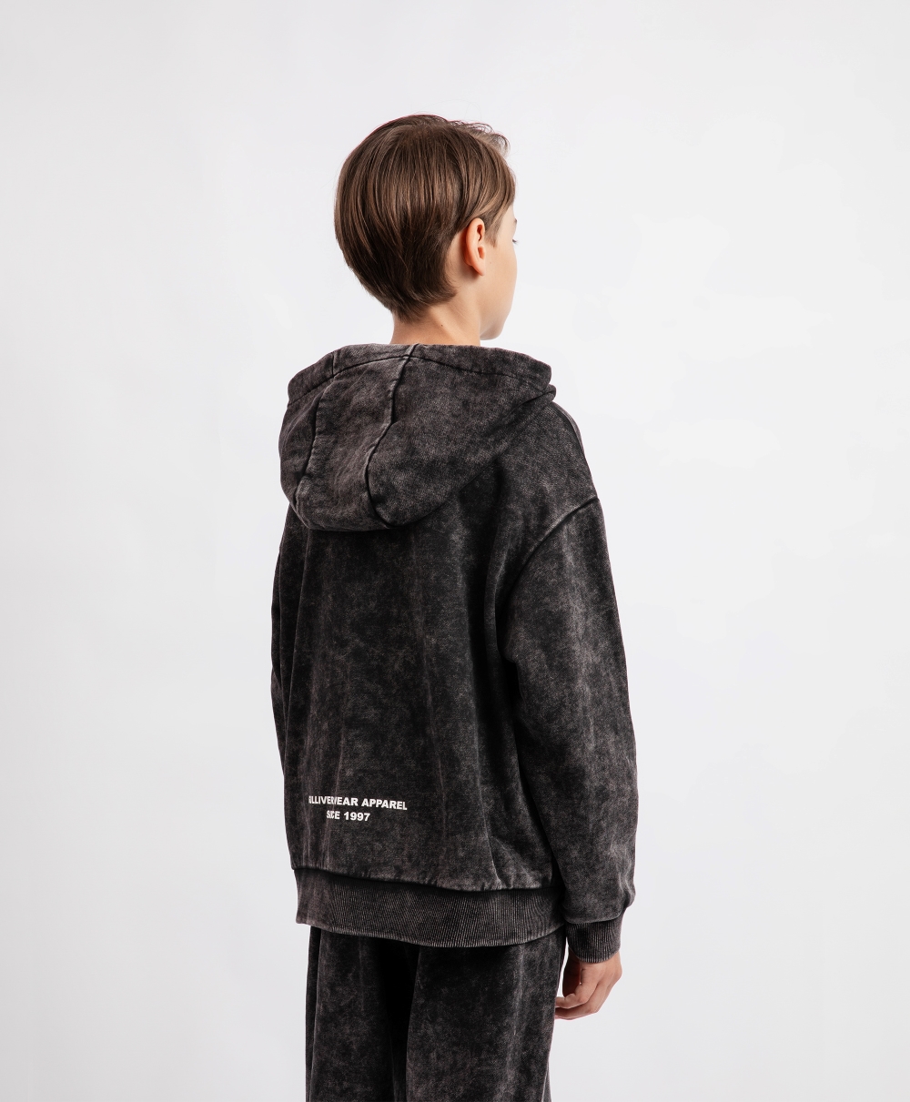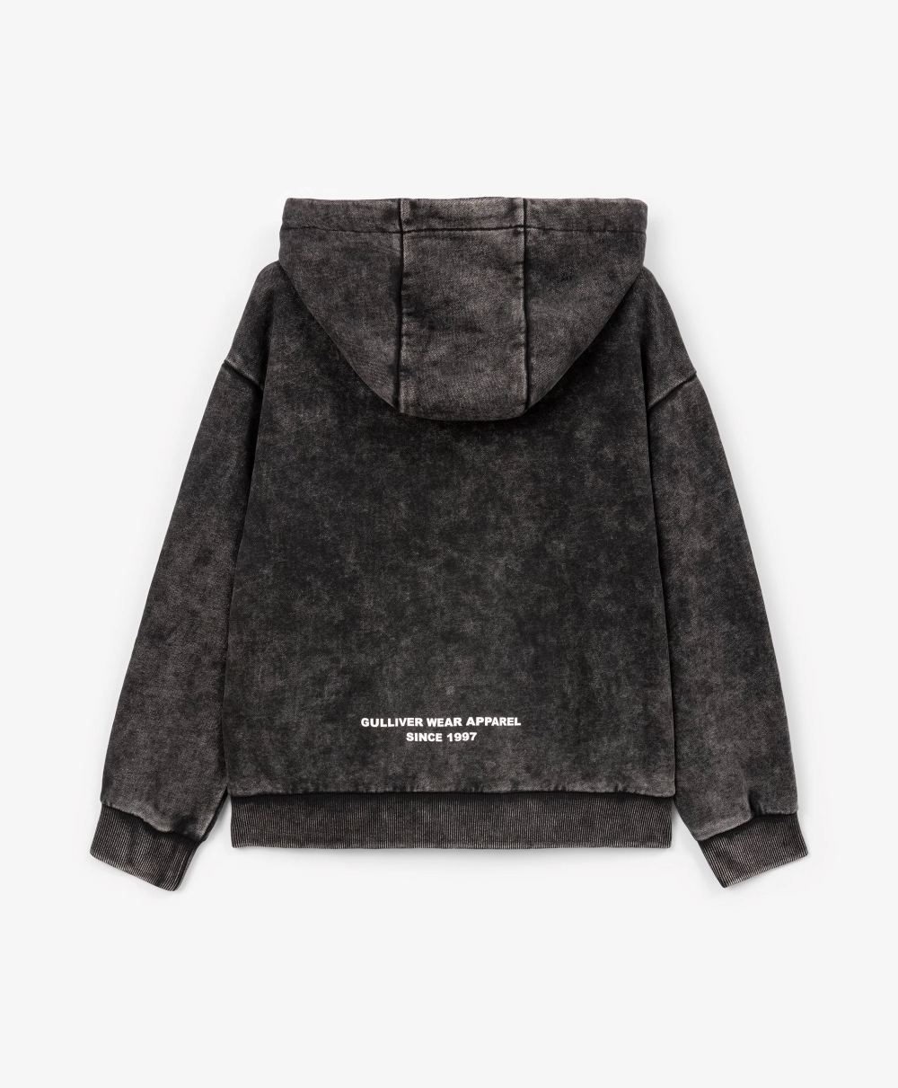 Распашная толстовка с капюшоном из вареного футера сделает осенне-зимний гардероб мальчика модным, практичным, функциональным! Очень мягкая, комфортная, с потертостями и непрокрасом, толстовка подчеркивает гранжевую стилистику в дизайне модели, придавая любым комплектам с ней стильный, дерзкий, брутальный вид. Толстовка застегивается на тракторную молнию, имеет удобные карманы-листочки. В оформлении модели использованы небольшие шрифтовые принты.