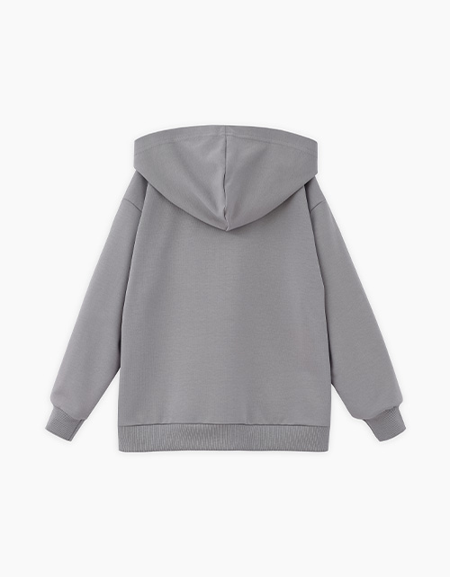 Зип-худи серо-зелёного оттенка. Прямая объёмная модель. Приспущенная линия плеча. Эластичные манжеты и низ изделия. Накладной карман-кенгуру с клапаном. Контрастная декоративная подвеска на молнии. Комбинация материалов: футер и твил. Авторский декор.