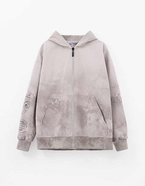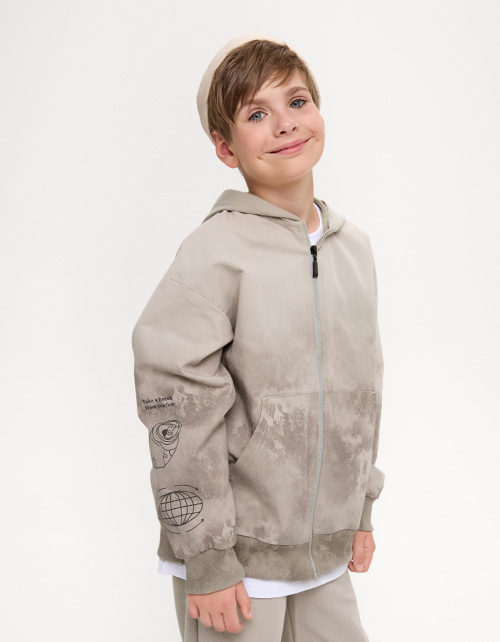 Зип-худи для мальчика. Модель прямого силуэта из твила и мягкого футера с браш-эффектом с объёмным низом на рибане - удобная и практичная. Капюшон и карманы-кенгуру добавляют комфорта, застёжка на молнию. Дополнен авторским цифровым принтом.