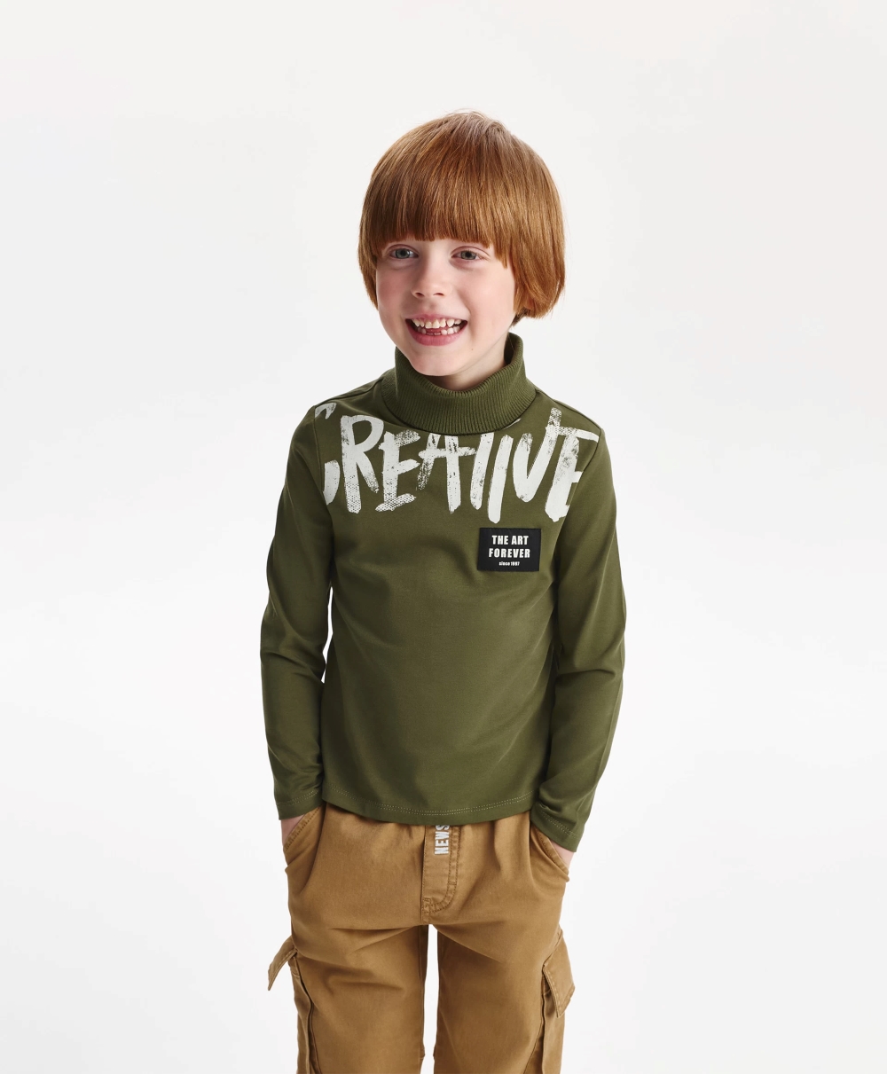 Трикотажная водолазка – прекрасное решение для осеннего гардероба мальчика. Водолазка цвета хаки выполнена из мягкого хлопкового полотна с эластаном. Высокая горловина, связанная из теплой и уютной хлопковой пряжи, создает интересный визуальный и тактильный контраст. В оформлении модели использован крупный шрифтовой принт и минималистичная нашивка.