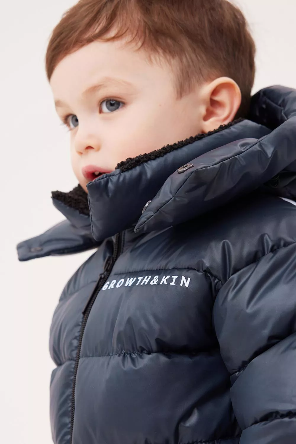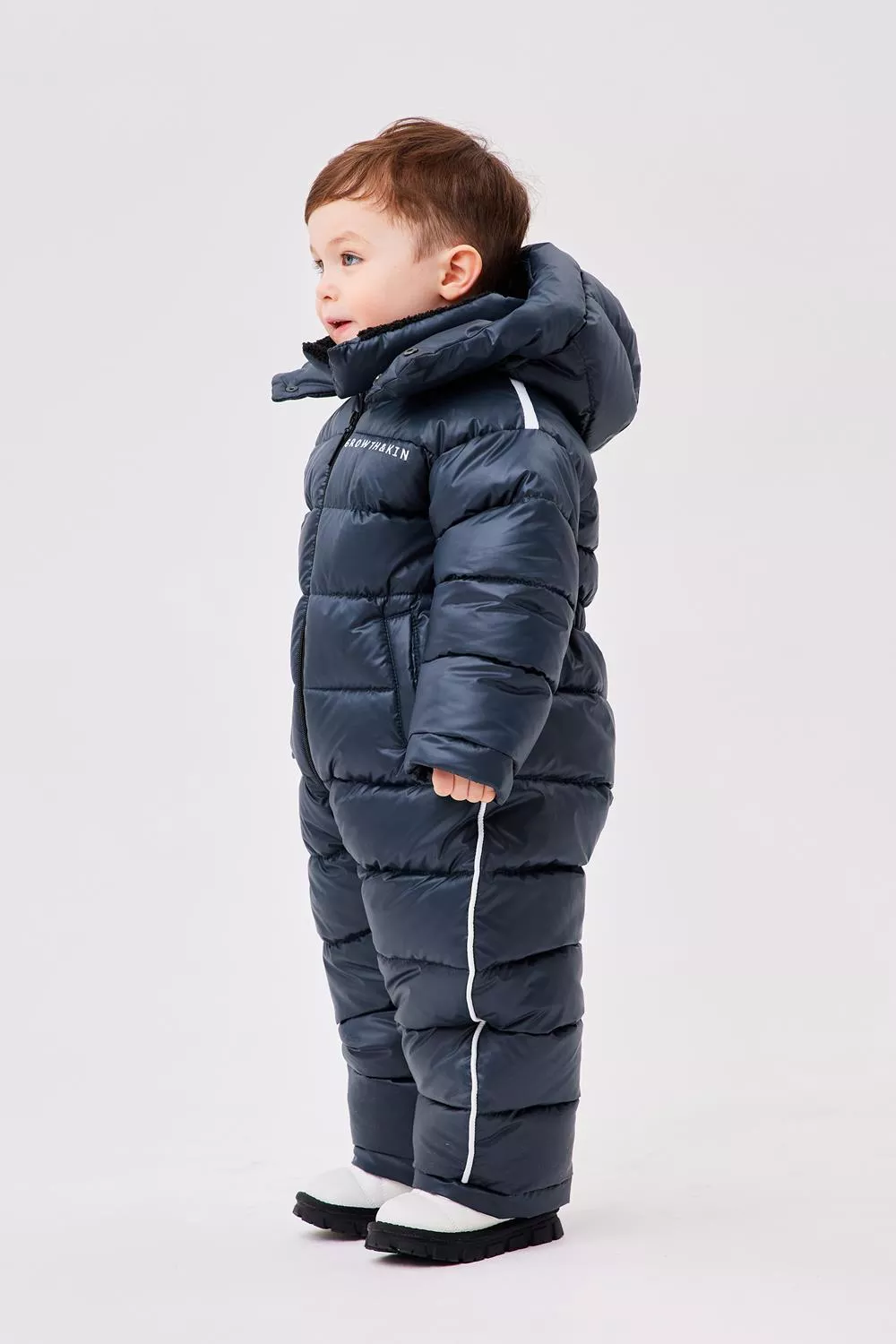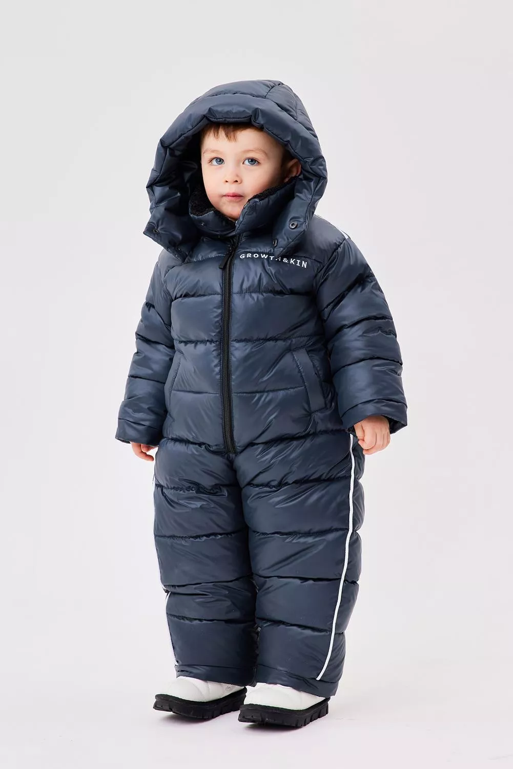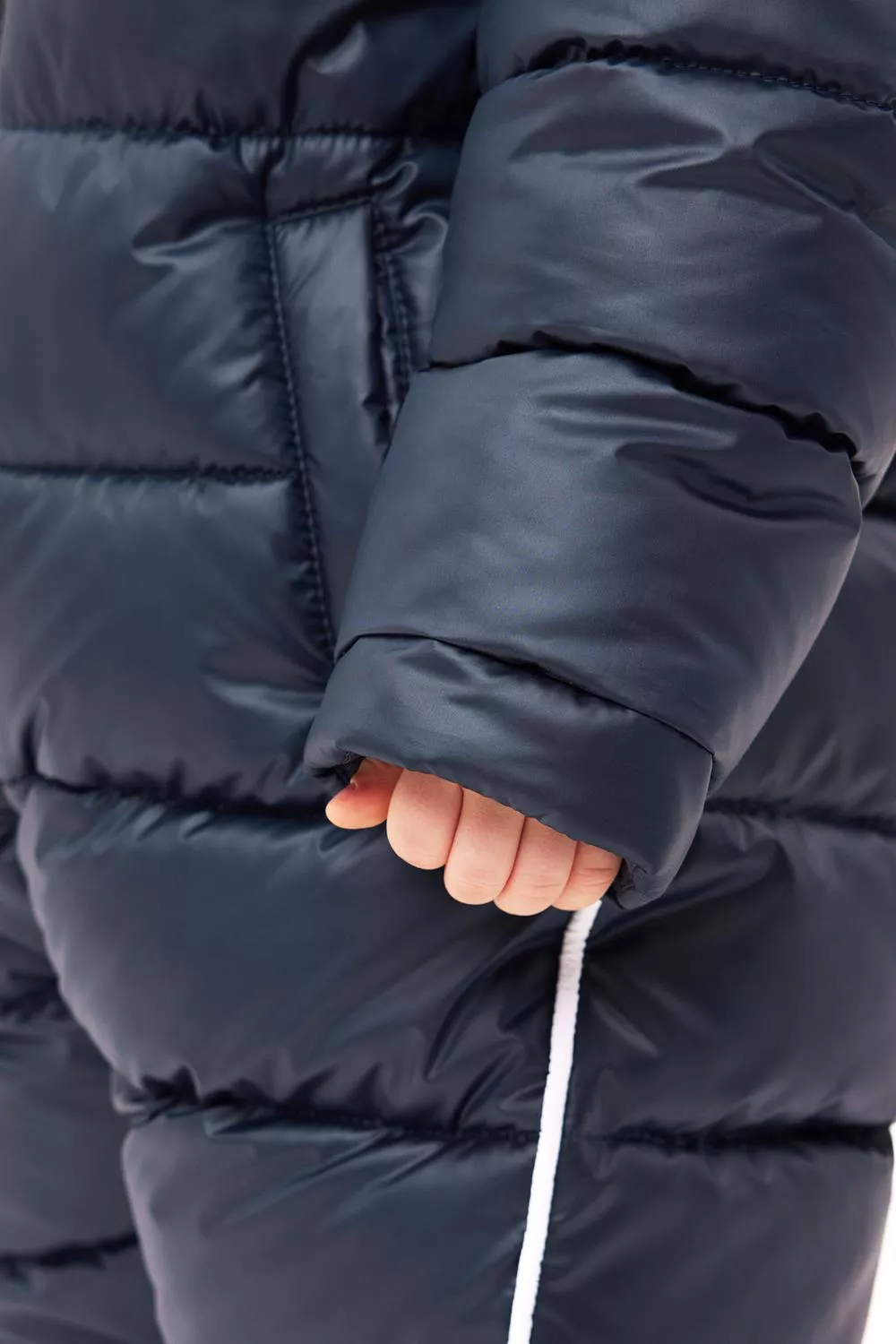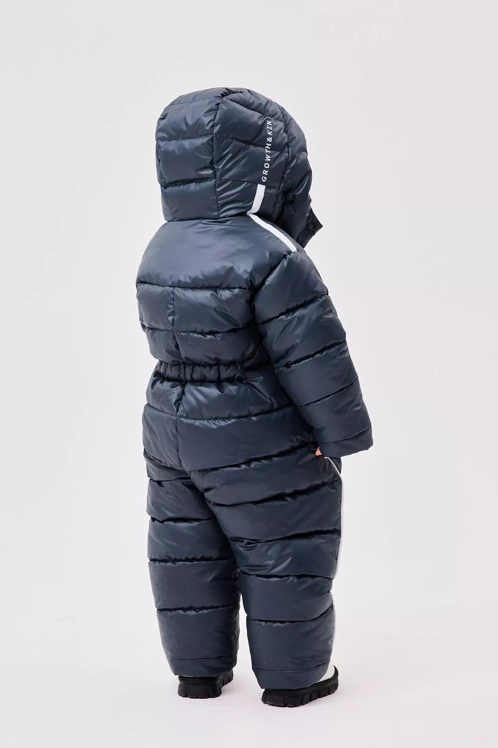Комбинезон свободного кроя со слегка спущенной линией плеча. Рукав втачной, одношовный. Воротник-стойка, с застежкой на потайные кнопки, с внутренней стороны утеплен искусственным мехом. Капюшон-шлем двухшовный, не съемный с застежкой на потайные кнопки. По краю капюшона широкая регулируемая кулиса на шнур-резинку и стопор. Комбинезон с центральной застежкой на тесьму-молнию и нижней ветрозащитной планкой. Перед и спинка с отрезной кокеткой. По плечевым швам отделочная тесьма. В нижней части переда выполнены боковые карманы с листочкой. По боковой части переда от проймы и до низа брюк отделочный кант. На спинке нерегулируемая кулиса на широкую резинку.