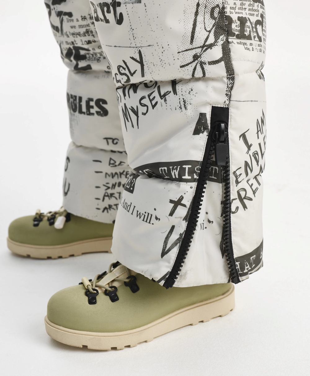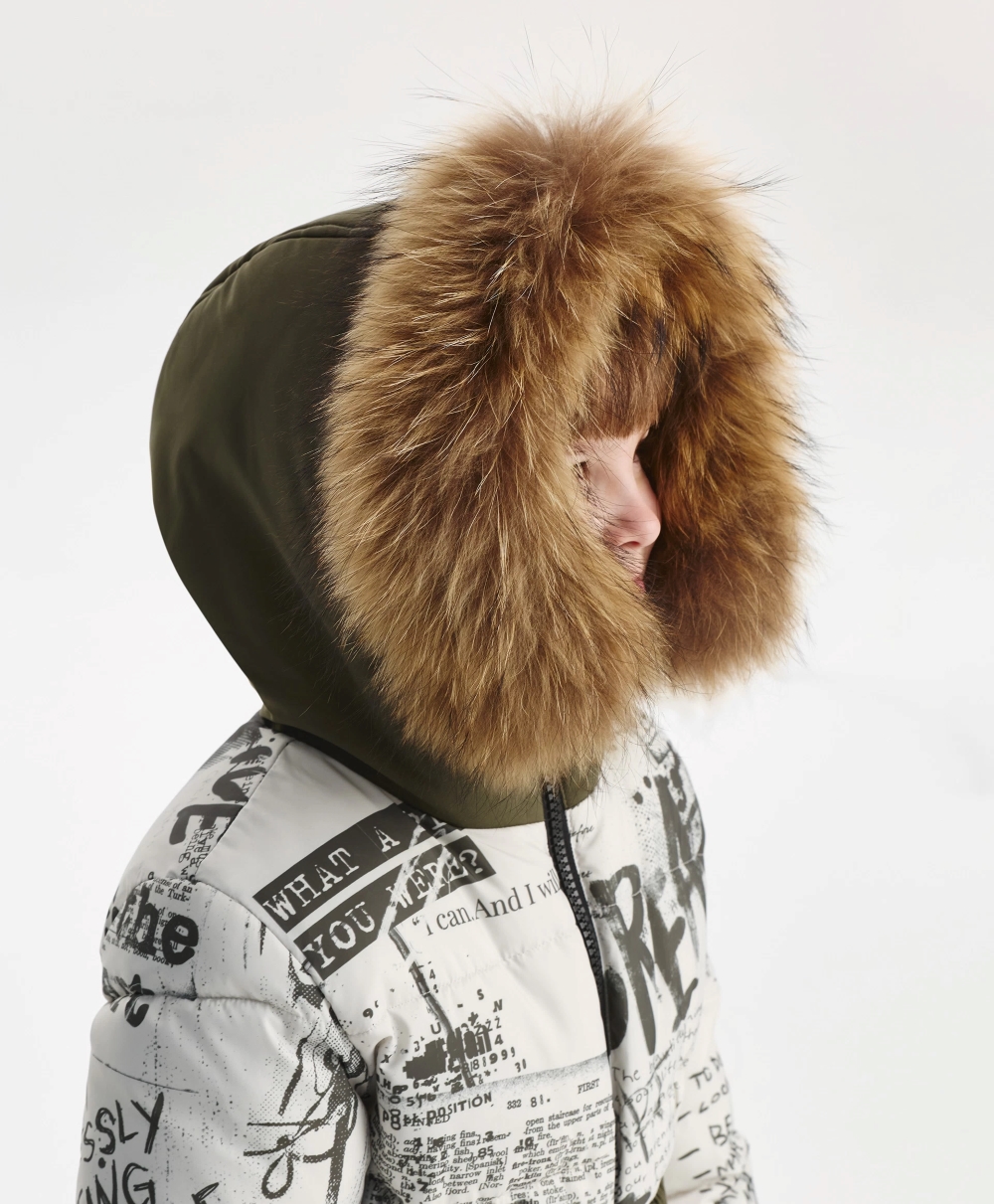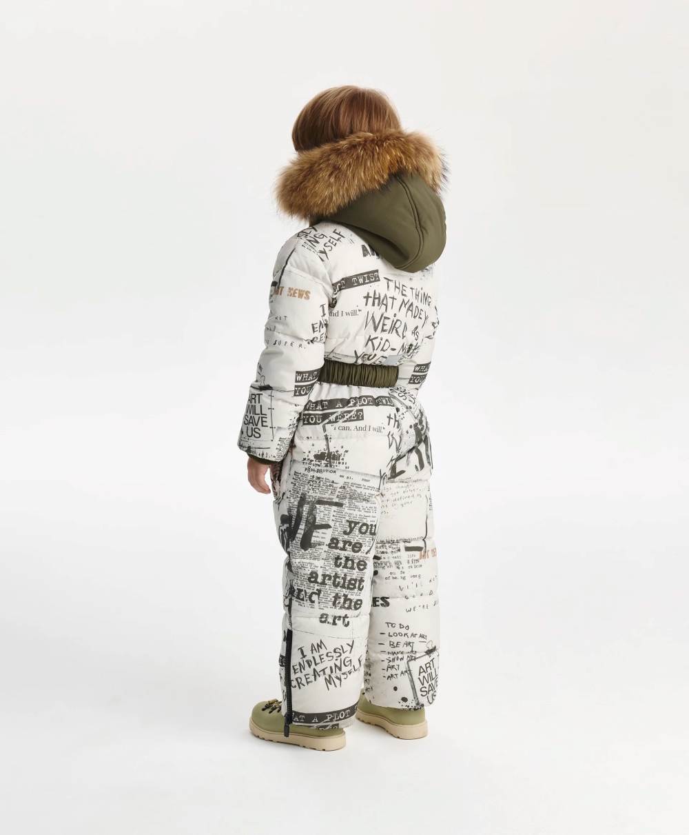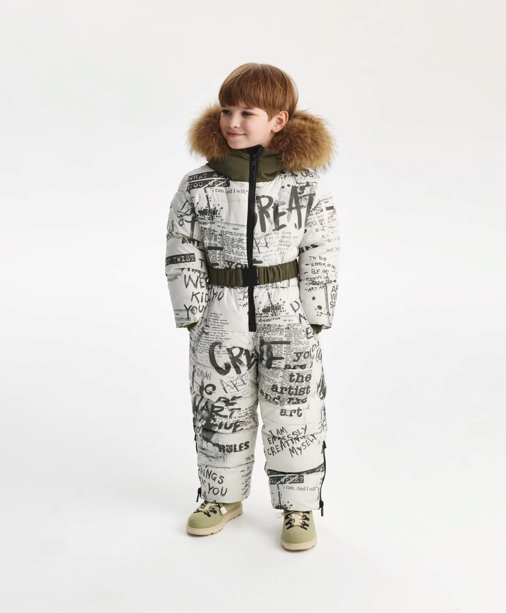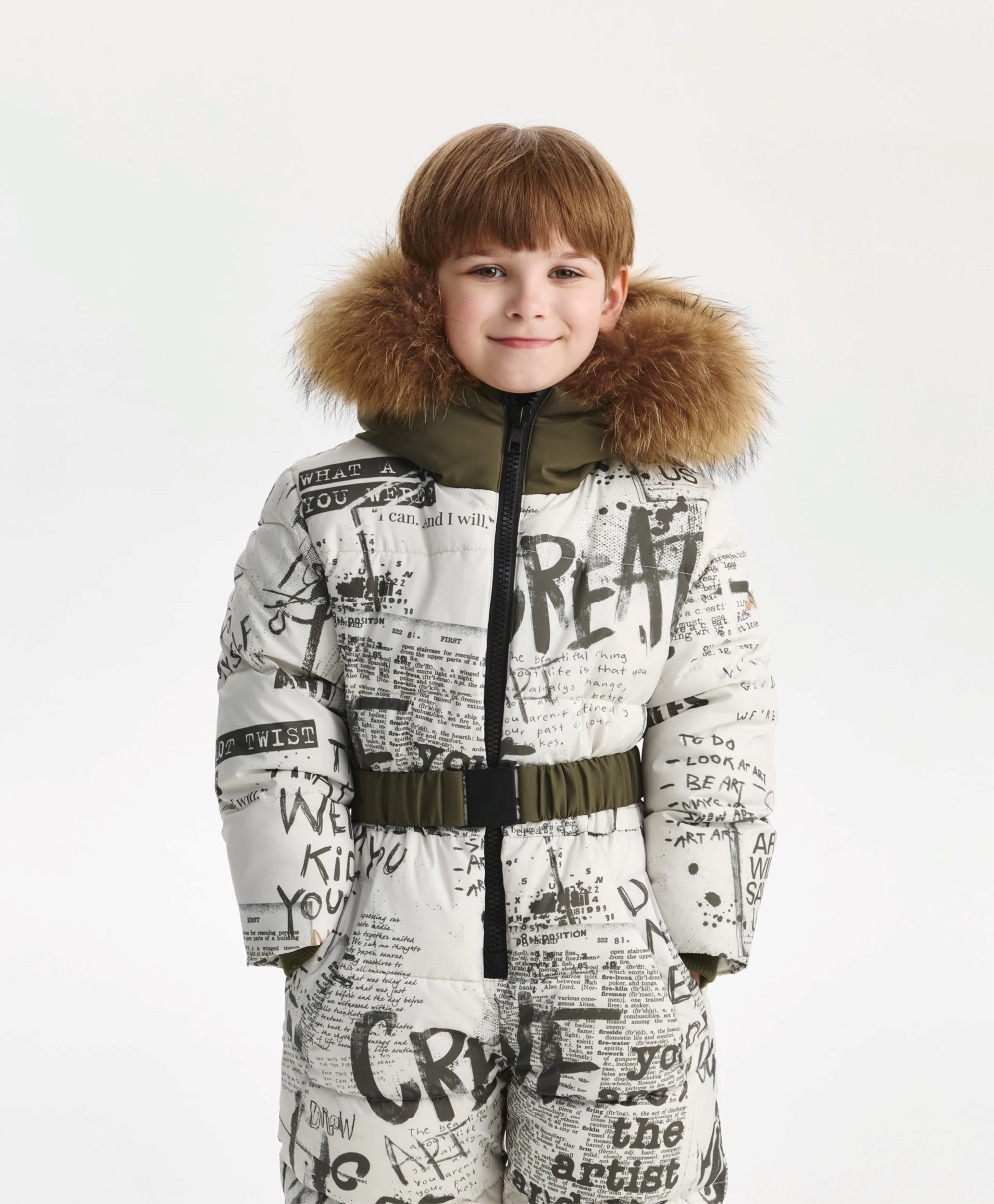 Стеганый комбинезон из плащовки искусственном пуху и подкладке из флиса - незаменимый атрибут для активного зимнего времяпрепровождения мальчика. Комбинезон выполнен из плащевого материала с модным "газетным" рисунком, дополненным динамичной шрифтовой графикой, нанесенной от руки размашисто и дерзко, что придаёт изделию уникальные черты, делает комбинезон драйвовым, стильным, практичным. Отделка из однотонной плащовки, сформированная по принципу колорблокинга, уравновешивает динамичный рисунок, создает гармоничный баланс, способствует свежему восприятию вещи. Кроме того, комбинезон имеет множество функциональных деталей, способных обеспечить ребёнку максимальное удобство на прогулке в морозный день: карманы на кнопках, капюшон с отстёгивающимся мехом енота, рибовые манжеты, молнии по низу брюк, позволяющие носить обувь разной высоты и объема, снегозащитные манжеты, съемный пояс с пряжкой. Комбинезон застёгивается на молнию с внутренней ветрозащитной планкой.