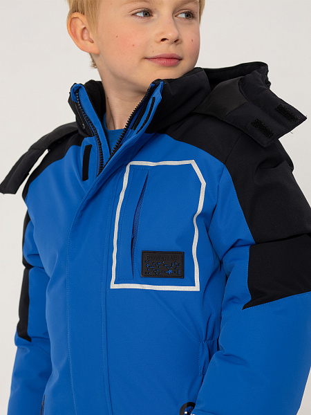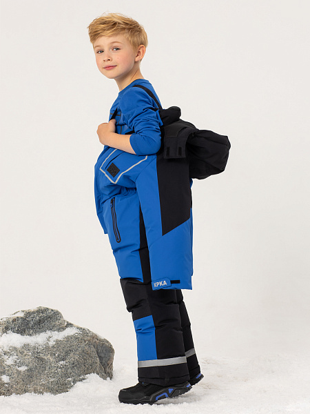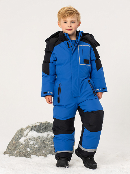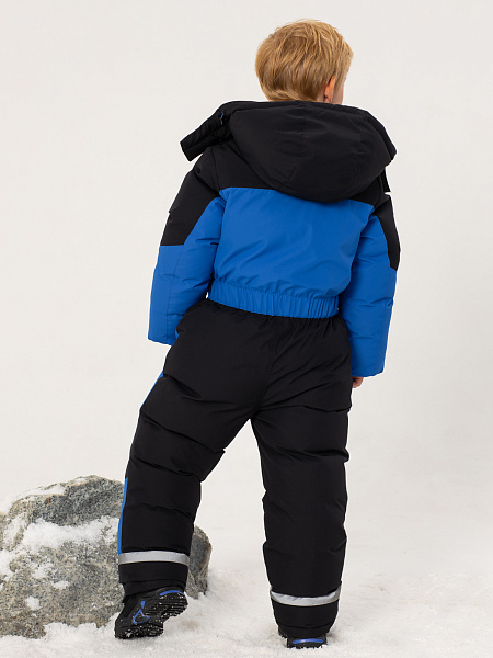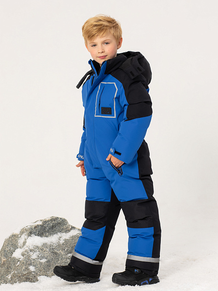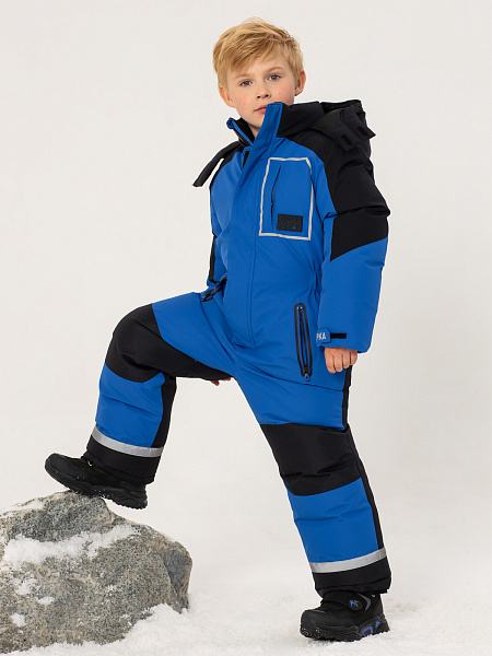 Практичный зимний комбинезон для мальчика — надёжная защита в холодную погоду. Модель выполнена в стильном сочетании ярко-синего и чёрного цветов. Мембранная ткань с показателями 5000 мм/5000 г/м² эффективно защищает от влаги и ветра. Утеплитель 300 г/м² сохраняет тепло. Центральная молния с ветрозащитной планкой обеспечивает удобство и защиту от холода. Проклеенные швы гарантируют водонепроницаемость. Регулируемый капюшон и манжеты из эластичного риба защищают от непогоды. Усиленные колени из уплотнённой ткани продлевают срок службы изделия. Светоотражающие элементы повышают безопасность в тёмное время. Комбинезон идеально подходит для активных зимних прогулок.