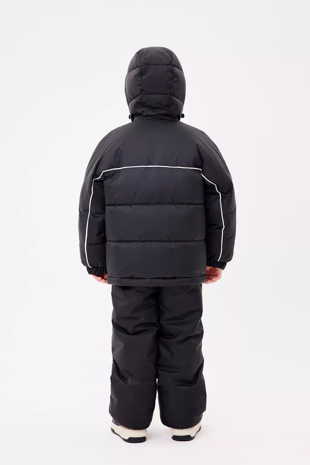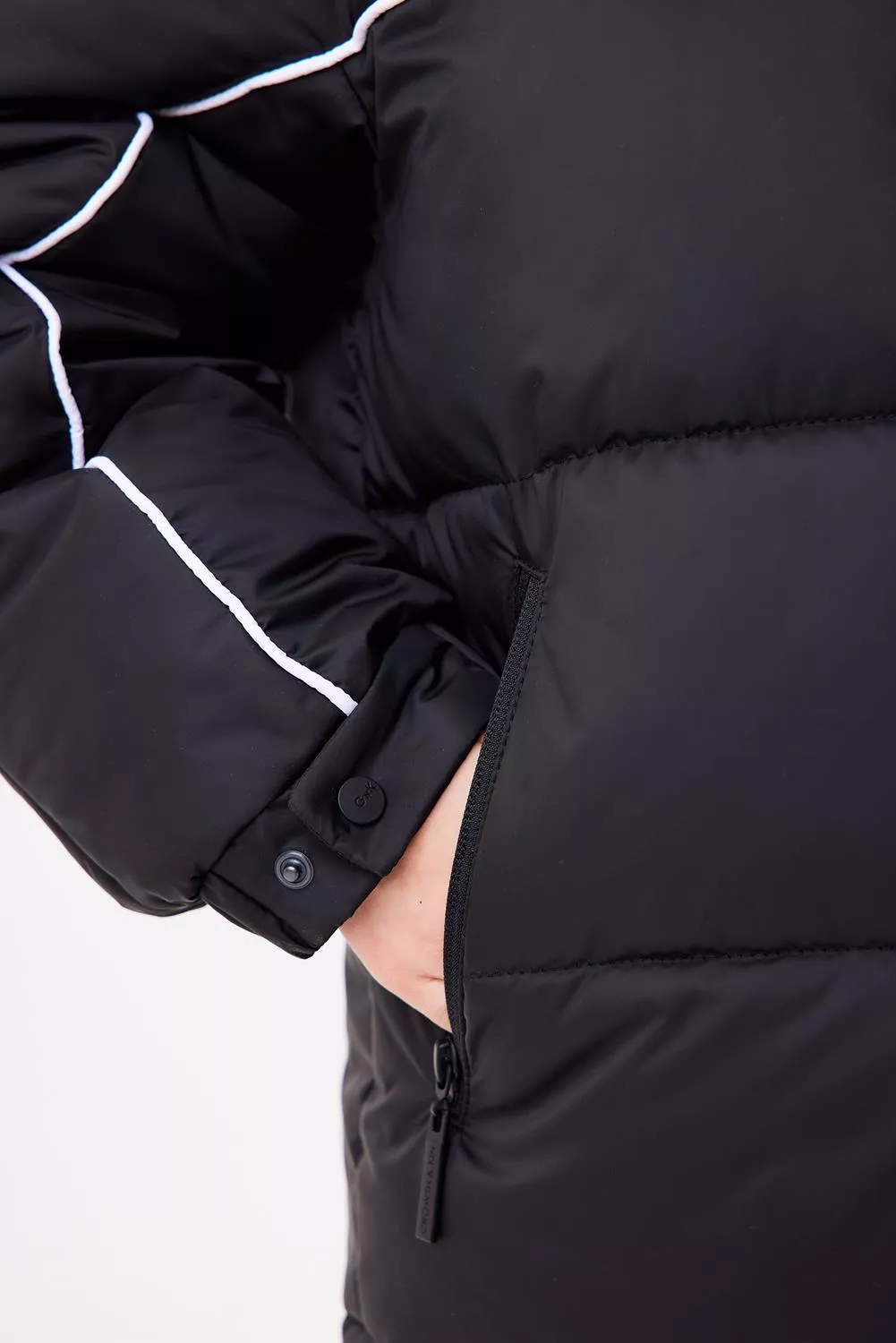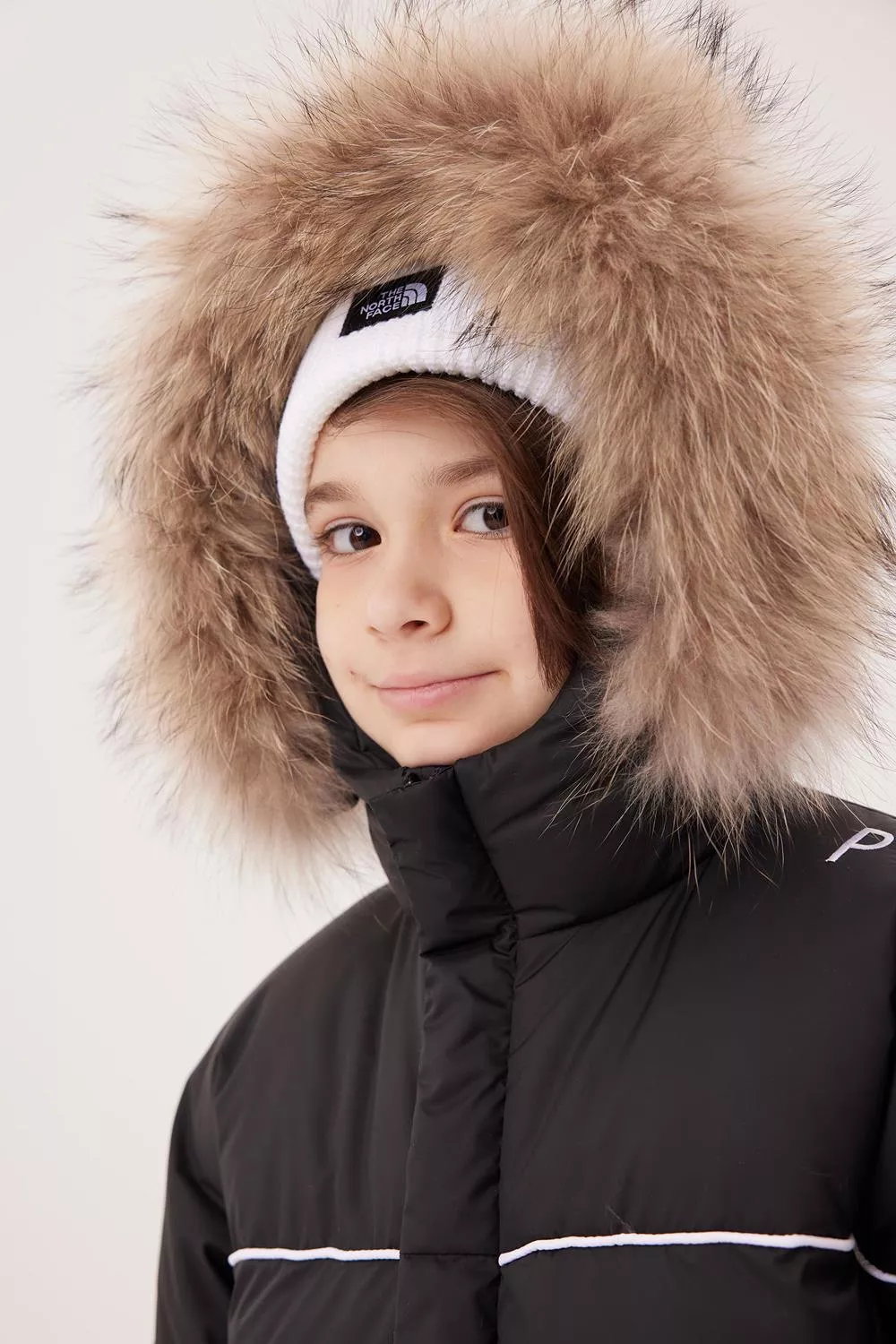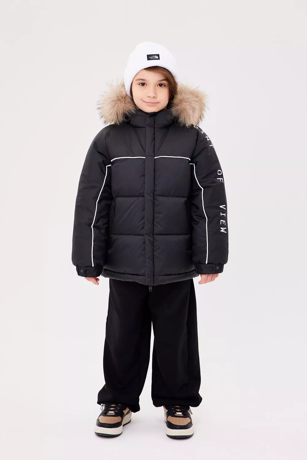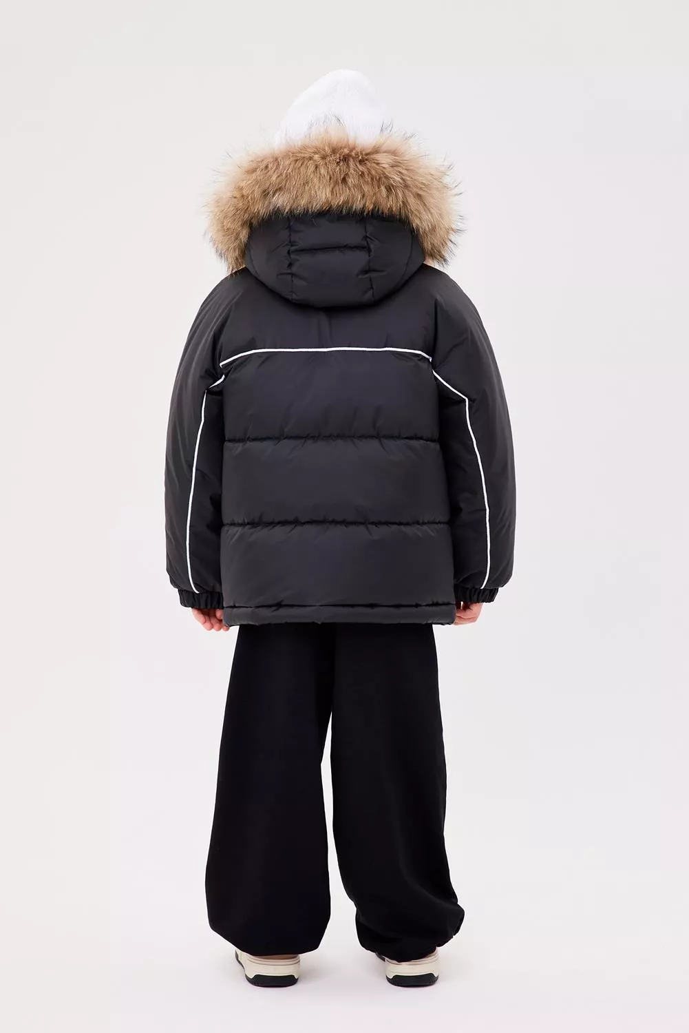 Куртка прямая, со слегка спущенной линией плеча. Рукав комбинированный. Воротник цельнокроеный с капюшоном с застежкой на тесьму-молнию. Капюшон втачной, двухшовный. По краю капюшона, съёмная опушка из натурального меха на застежку-молнию и регулируемая кулиса на шнур и стопор. Застежка центральная на тесьму-молнию, закрытая притачной верхней планкой и внутренней ветрозащитной планкой. Перед и спинка с отрезной кокеткой переходящей на рукав. В нижней части переда расположены боковые карманы на застежку-молнию. С внутренней стороны куртки предусмотрены бретели-держатели. По низу рукава притачная манжета на резинке с патом на кнопку с возможностью регулировки ширины манжета. С внутренней стороны рукава трикотажный напульсник. Низ куртки с притачной кулисой, с внутренней стороны регулируемой на шнур-резинку и стопор. Нижняя часть курки и капюшон стегана горизонтальными переборками.