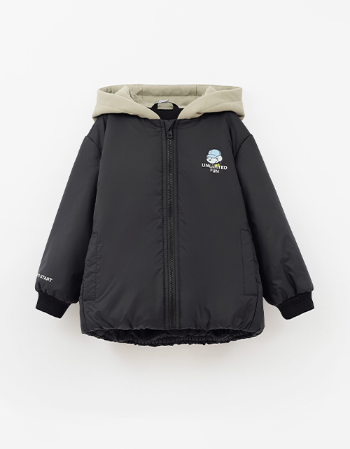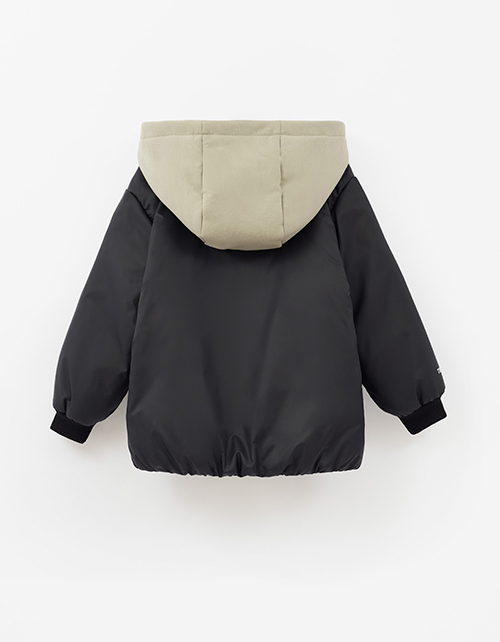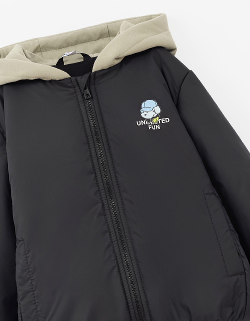 Чёрная куртка на гипоаллергенном синтепоне. Объёмный силуэт с низом на эластичной резинке. Матовая плащевая ткань и хлопковая подкладка. Контрастный капюшон с мягким футром внутри, рукава на рибане. Карманы в шве. Авторский декор. Рекомендуем от +5.