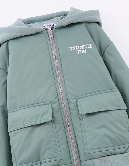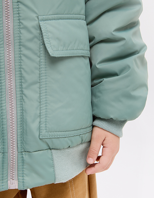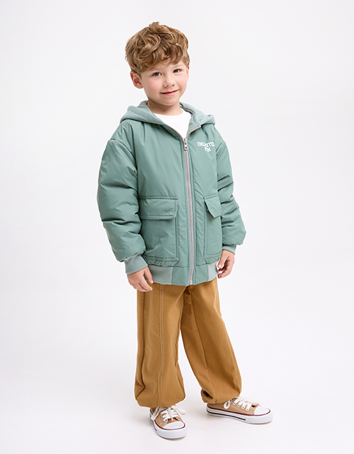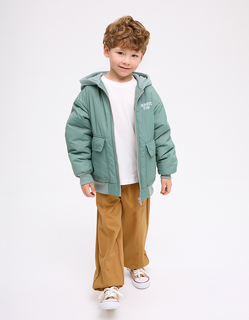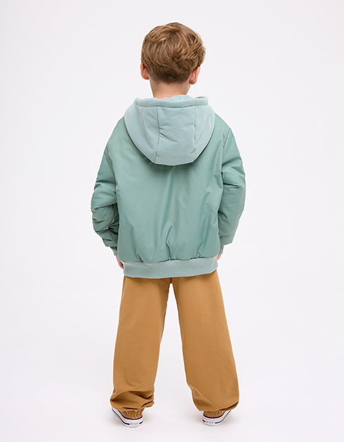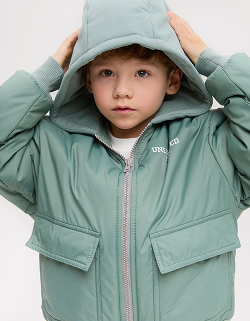 Куртка-бомбер на гипоаллергенном синтепоне для мальчика. Прямой объёмный силуэт с низом на рибане. Матовая плащевая ткань и хлопковая подкладка. Капюшон, накладные карманы с клапаном, молния в тон. Декор - термотрансферная плёнка. Рекомендовано от +5.