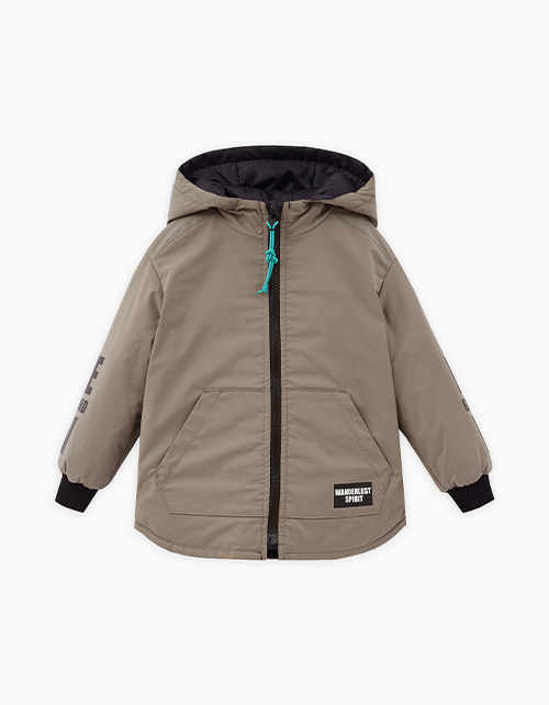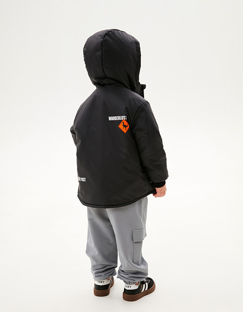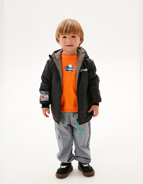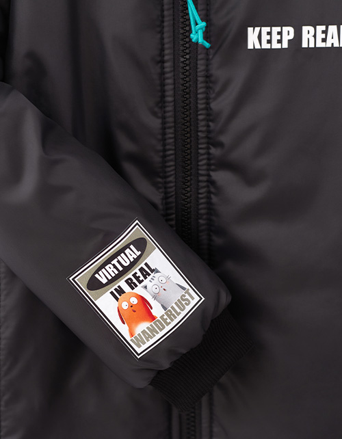 Прямая модель. Приспущенная линия плеча. Эластичные манжеты. Куртка декорирована авторскими принтами. Декоративная подвеска на молнии. Рекомендуемая температура: +5:+15, в зависимости от второго слоя и особенностей ребёнка.