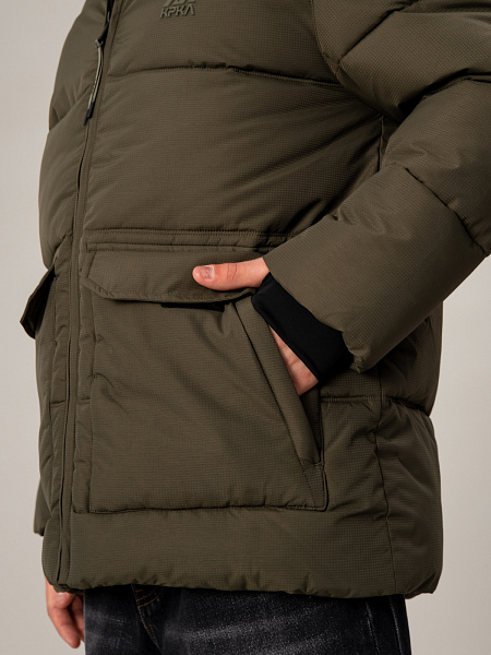 Тёплый зимний пуховик для мальчика в цвете хаки с мембранной тканью 5000 мм / 5000 г/м² и утеплителем из искусственного пуха плотностью 350 г/м². Модель отличается эффективной защитой от влаги и отличной воздухопроницаемостью. Горизонтальная стёжка придаёт стильный вид, а регулируемый капюшон обеспечивает комфортную посадку. Пуховик оснащён центральной молнией, функциональными накладными карманами с клапанами и молниями, эластичными манжетами на рукавах. Продуманная конструкция гарантирует тепло и комфорт в холодную погоду.