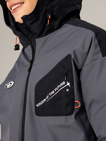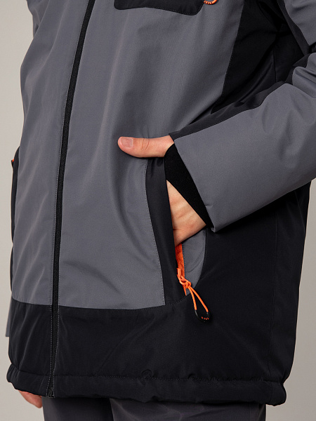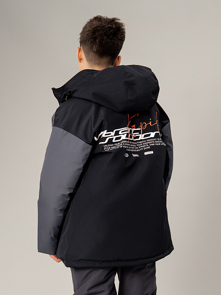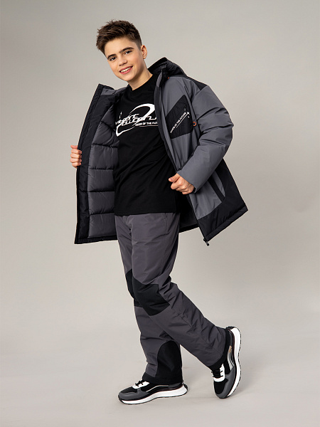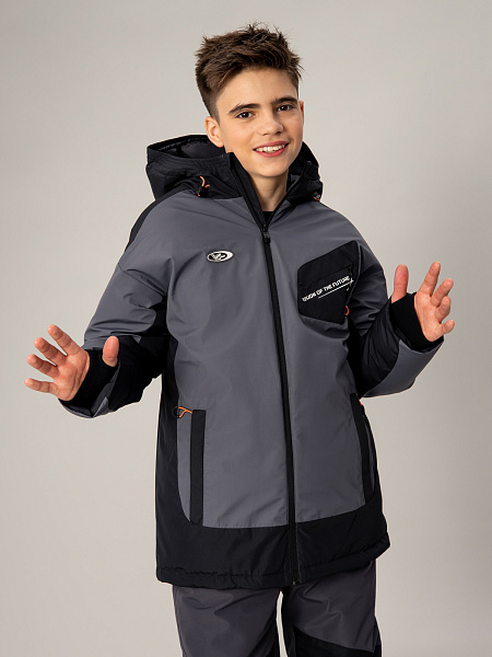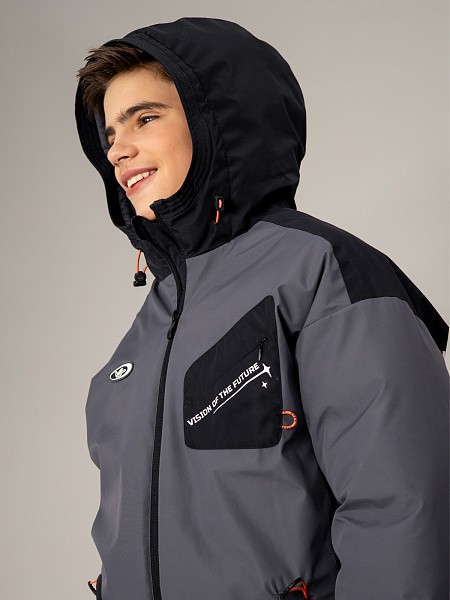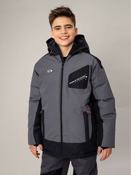 Стильный пуховик для мальчика в сочетании серого и чёрного цветов — надёжная защита от холода. Прочный материал с мембраной 5000 мм / 5000 г/м² обеспечивает отличную защиту от влаги и ветра, а искусственный пух плотностью 350 г/м² гарантирует комфортную температуру.Оригинальный дизайн дополнен асимметричным накладным карманом с молнией на груди, двумя практичными карманами на молнии спереди и выразительным принтом на спине. Контрастная оранжевая фурнитура придаёт модели современный вид. Удобная застёжка-молния, регулируемый капюшон и утяжка по низу позволяют настроить посадку по фигуре. Продуманная конструкция делает пуховик идеальным выбором для активных зимних прогулок.