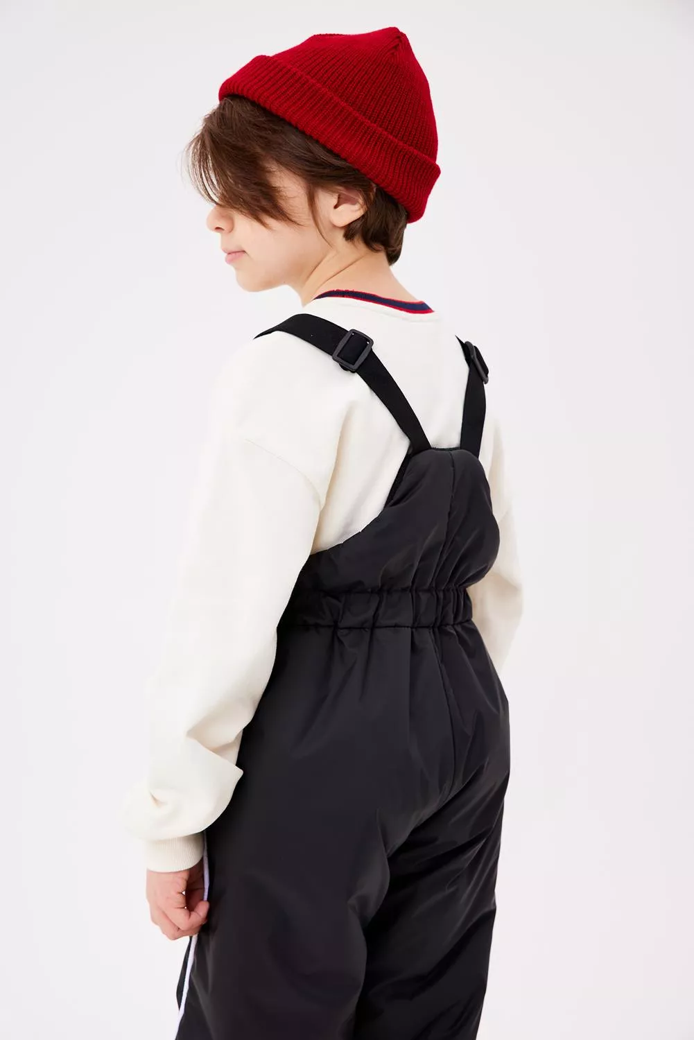Полукомбинезон прямого силуэта со смещенными на перед боковыми швами. Верхняя часть полукомбинезона с застежкой на тесьму-молнию. Бретели на полукомбинезоне регулируемые по длине, за счет резинки с рамкой. Верхняя внутренняя часть полукомбинезона на флисе, нижняя часть на шелковой подкладке. На уровне талии по переду и спинке предусмотрена кулиса на широкую резинку. По боковым швам полукомбинезона канты отделочного цвета. Низ полукомбинезона с притачной кулисой на шнур-резинку. С внутренней стороны предусмотрена ветрозащитная манжета на резинке с латексом.