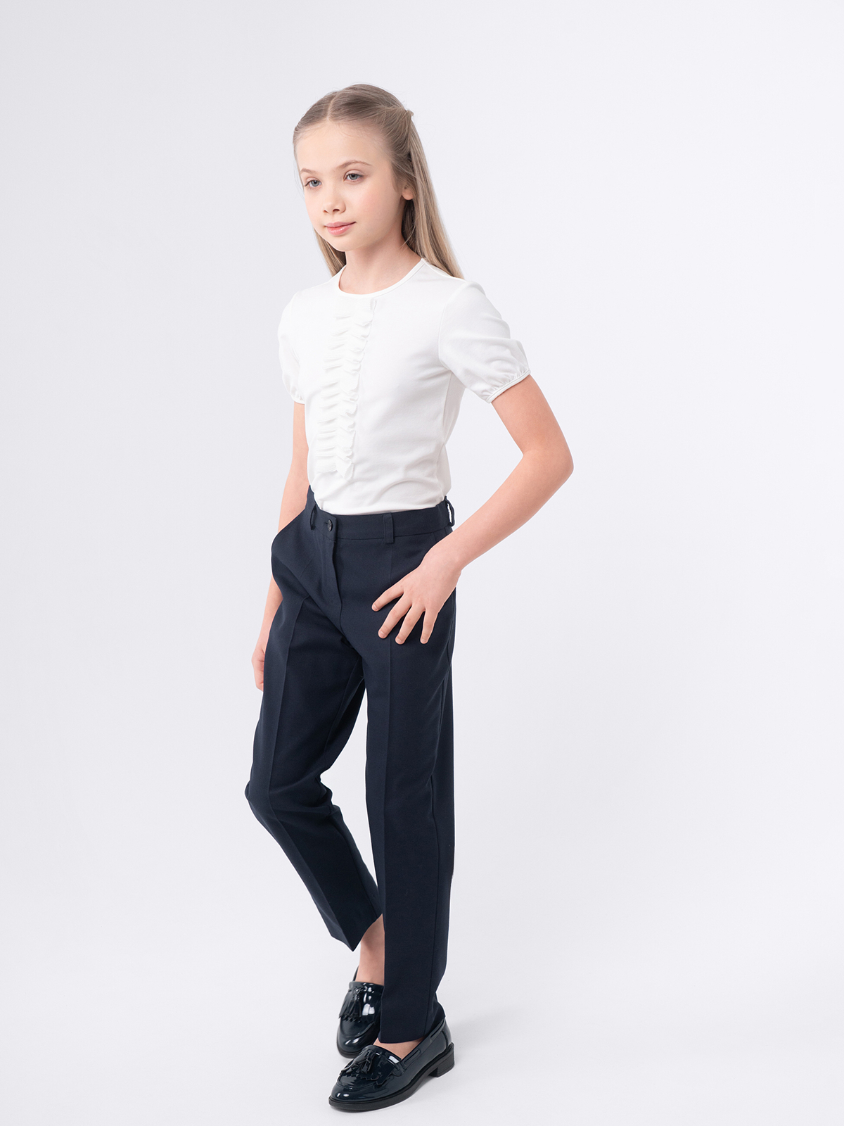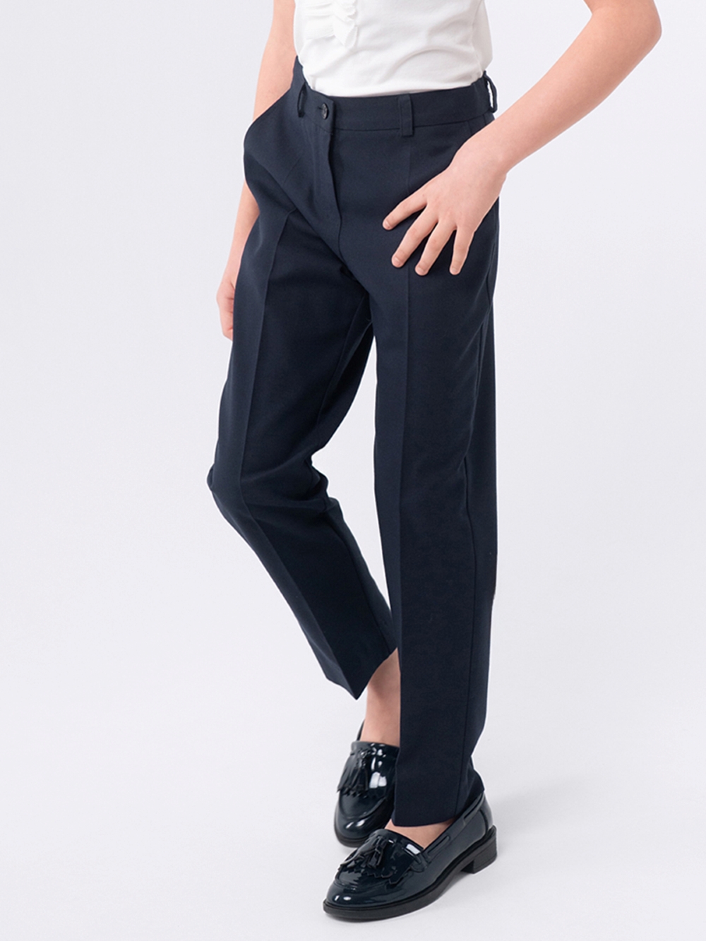 Прямые брюки со стрелками для девочек изготовлены из немнущейся костюмной ткани высокого качества, которая идеально подходит для брюк данного фасона. Высокая талия и пояс на резинке не стесняют движений. Застежка на молнию, петлю и пуговицу на поясе.Брюки имеют карманы достаточной глубины. Брюки  элегантно смотрятся на девочках любого роста.